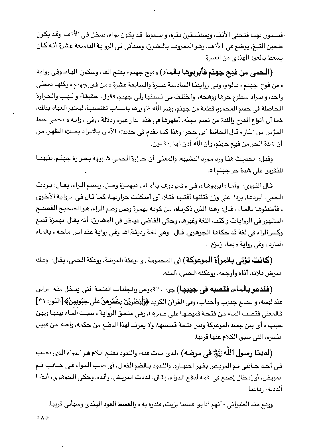(الحمى من فيح جهنم فأبردوها بالماء) "فيح جهنم" بفتح الفاء وسكون الياء، وفي رواية "من فوح جهنم" بالواو، وفي روايتنا السادسة عشرة والسابعة عشرة "من فور جهنم" وكلها بمعنى واحد، والمراد سطوع حرها ووهجه، واختلف في نسبتها إلى جهنم، فقيل: حقيقة، واللهب والحرارة الحاصلة في جسم المحموم قطعة من جهنم، وقدر الله ظهورها بأسباب تقتضيها، ليعتبر العباد بذلك، كما أن أنواع الفرح واللذة من نعيم الجنة، أظهرها في هذه الدار عبرة ودلالة، وفي رواية "الحمى حظ المؤمن من النار" قال الحافظ ابن حجر: وهذا كما تقدم في حديث الأمر، بالإبراد بصلاة الظهر، من أن شدة الحر من فيح جهنم، وأن الله أذن لها بنفسين.
