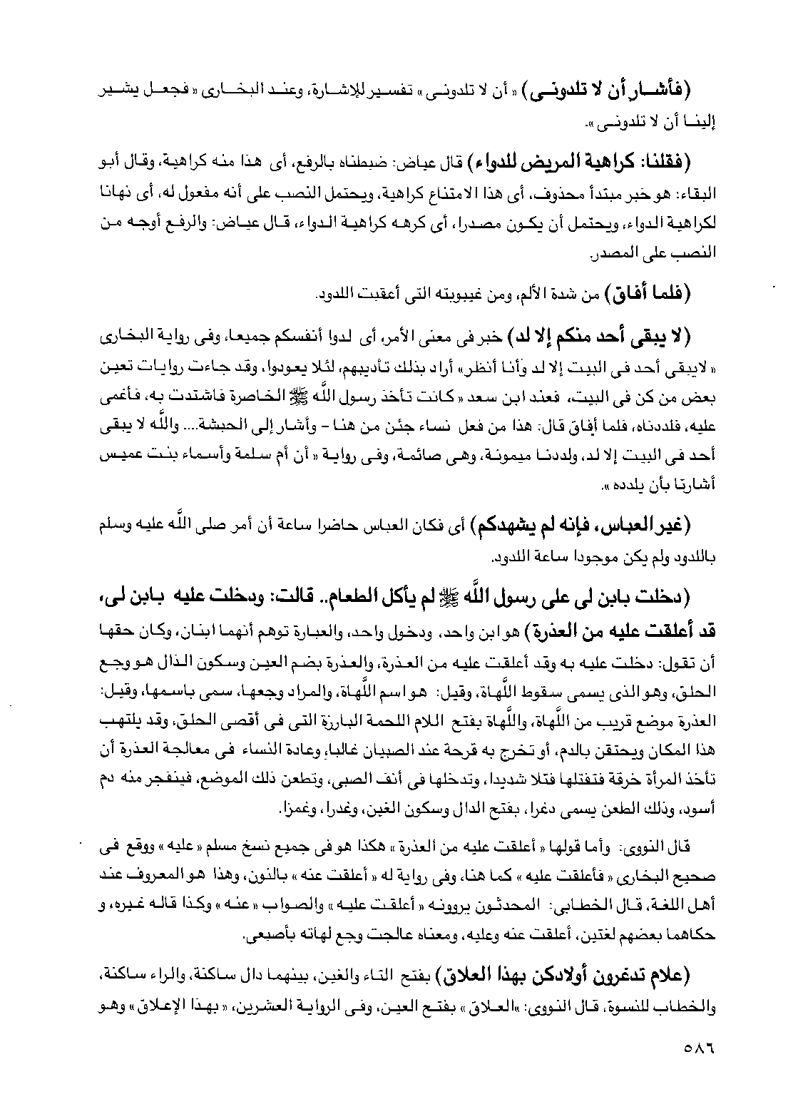 (لا يبقى أحد منكم إلا لد) خبر في معنى الأمر، أي لدوا أنفسكم جميعاً، وفي رواية البخاري "لا يبقى أحد في البيت إلا لد وأنا أنظر" أراد بذلك تأديبهم، لئلا يعودوا، وقد جاءت روايات تعين بعض من كن في البيت، فعند ابن سعد "كانت تأخذ رسول الله صلى الله عليه وسلم الخاصرة فاشتدت به، فأغمي عليه، فلددناه، فلما أفاق قال: هذا من فعل نساء جئن من هنا -وأشار إلى الحبشة .... والله لا يبقى أحد في البيت إلا لد، ولددنا ميمونة، وهي صائمة، وفي رواية "أن أم سلمة وأسماء بنت عميس أشارتا بأن يلدده".