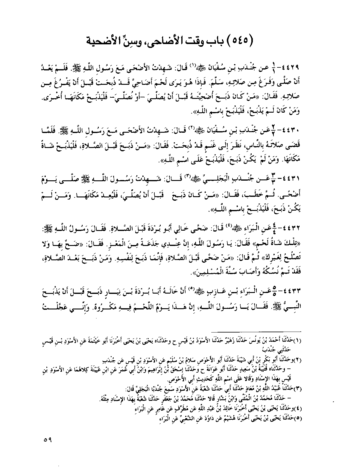 4430 - عن جندب بن سفيان رضي الله عنه قال: شهدت الأضحى مع رسول الله صلى الله عليه وسلم. فلما قضى صلاته بالناس، نظر إلى غنم قد ذبحت. فقال: "من ذبح قبل الصلاة، فليذبح شاة مكانها. ومن لم يكن ذبح، فليذبح على اسم الله".