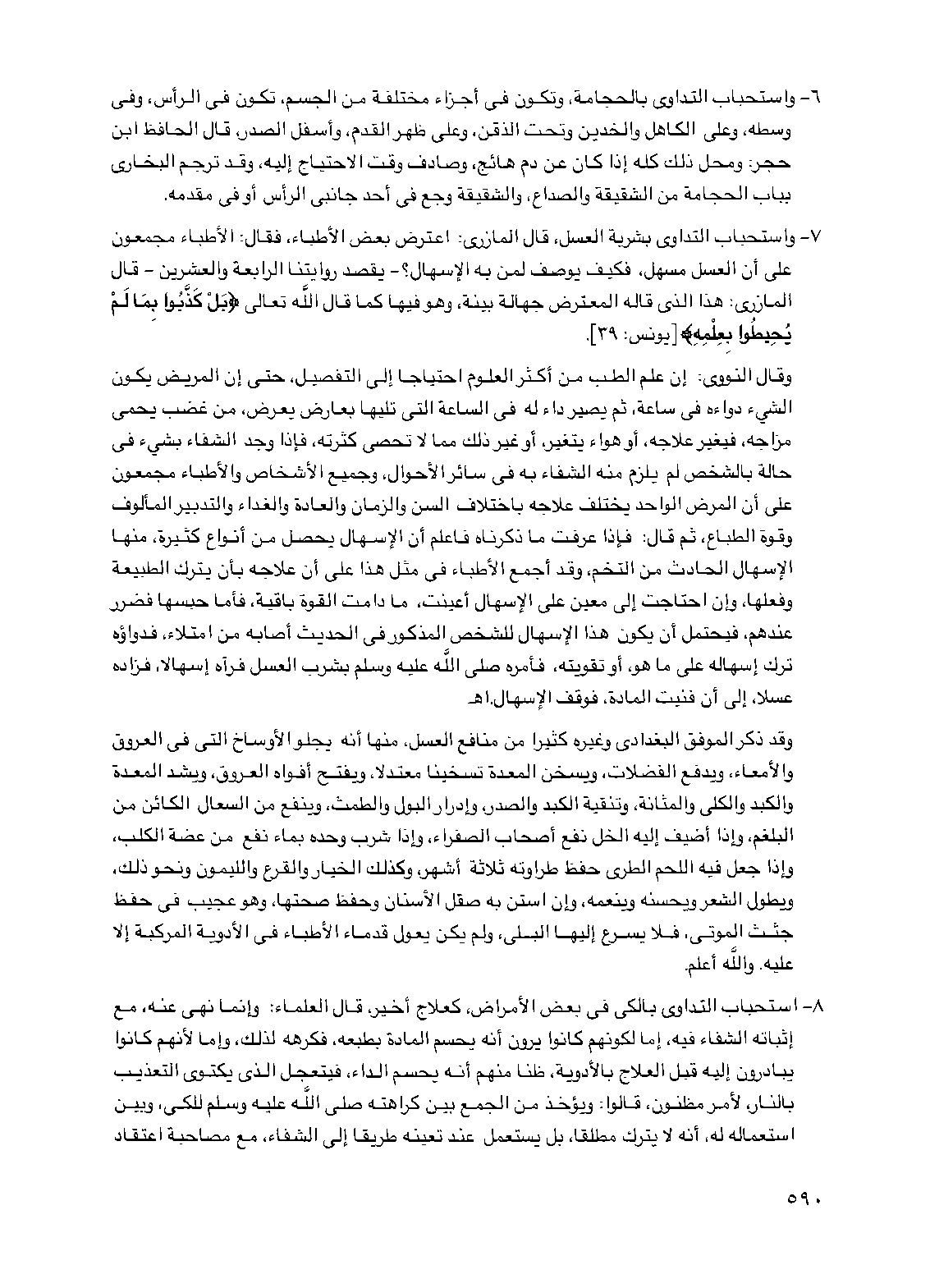 7 - واستحباب التداوي بشربة العسل، قال المازري: اعترض بعض الأطباء، فقال: الأطباء مجمعون على أن العسل مسهل، فكيف يوصف لمن به الإسهال؟ -يقصد روايتنا الرابعة والعشرين- قال المازري: هذا الذي قاله المعترض جهالة بينة، وهو فيها كما قال الله تعالى (بل كذبوا بما لم يحيطوا بعلمه) [يونس: 39].