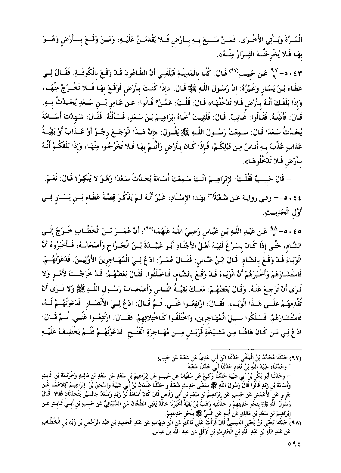 5043 - عن حبيب قال: كنا بالمدينة فبلغني أن الطاعون قد وقع بالكوفة. فقال لي عطاء بن يسار وغيره: إن رسول الله صلى الله عليه وسلم قال: "إذا كنت بأرض فوقع بها فلا تخرج منها، وإذا بلغك أنه بأرض فلا تدخلها" قال: قلت: عمن؟ قالوا: عن عامر بن سعد يحدث به. قال: فأتيته. فقالوا: غائب. قال: فلقيت أخاه إبراهيم بن سعد، فسألته. فقال: شهدت أسامة يحدث سعداً قال: سمعت رسول الله صلى الله عليه وسلم يقول: "إن هذا الوجع رجز أو عذاب أو بقية عذاب عذب به أناس من قبلكم، فإذا كان بأرض وأنتم بها فلا تخرجوا منها، وإذا بلغكم أنه بأرض فلا تدخلوها".
