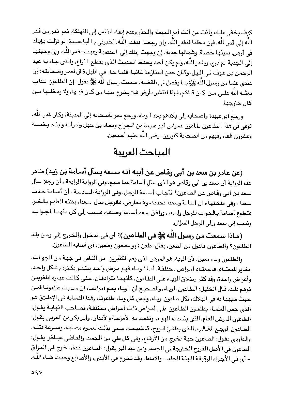 (عن عامر بن سعد بن أبي وقاص عن أبيه أنه سمعه يسأل أسامة بن زيد) ظاهر هذه الرواية أن سعد بن أبي وقاص هو الذي سأل أسامة عما سمع، وفي الرواية الرابعة "أن رجلاً سأل سعد بن أبي وقاص عن الطاعون؟ فأجاب أسامة الرجل، وفي الرواية السادسة "أن أسامة حدث سعداً" وفي ملحقها "أن أسامة وسعداً تحدثا" ولا تعارض، فالرجل سأل سعداً، يظنه العليم بالخبر، فتطوع أسامة بالجواب للرجل ولسعد، ووافق سعد أسامة وصدقه، فنسب إلى كل منهما الجواب، ونسب إلى سعد وإلى الرجل السؤال.