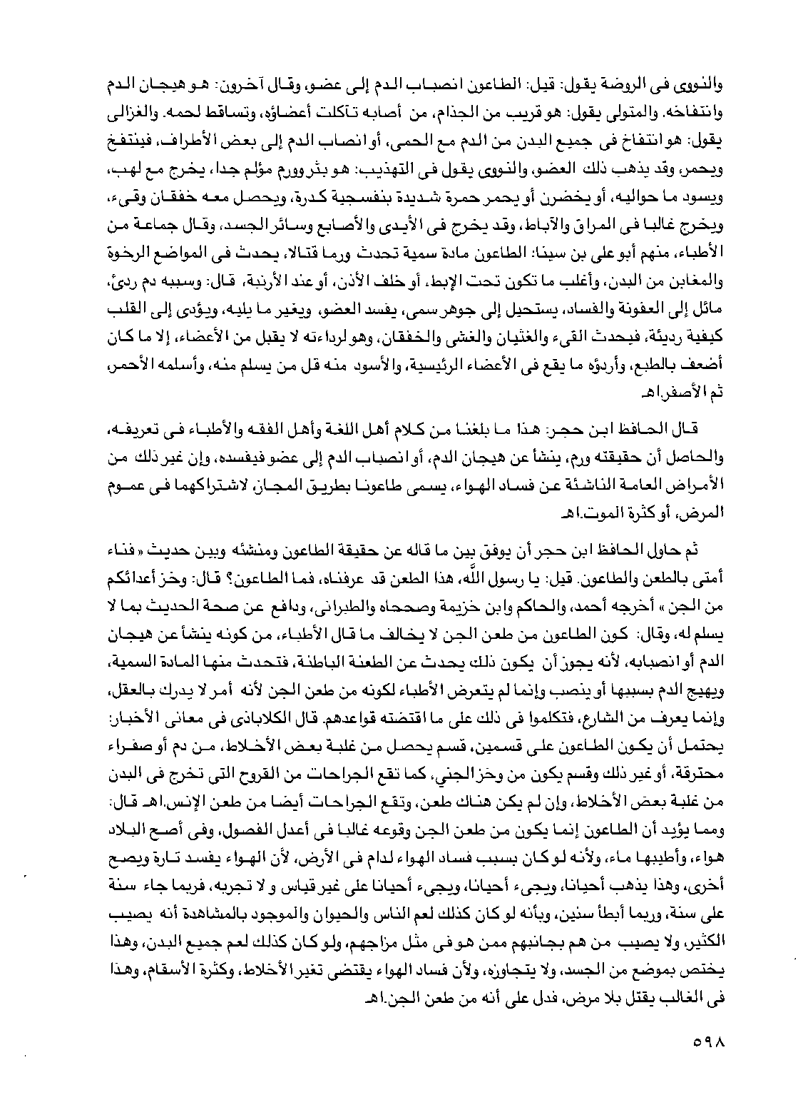 والنووي في الروضة يقول: قيل: الطاعون انصباب الدم إلى عضو، وقال آخرون: هو هيجان الدم وانتفاخه. والمتولي يقول: هو قريب من الجذام، من أصابه تآكلت أعضاؤه، وتساقط لحمه. والغزالي يقول: هو انتفاخ في جميع البدن من الدم مع الحمى، أو انصباب الدم إلى بعض الأطراف، فينتفخ ويحمر، وقد يذهب ذلك العضو، والنووي يقول في التهذيب: هو بثر وورم مؤلم جداً، يخرج مع لهب، ويسود ما حواليه، أو يخضرن أو يحمر حمرة شديدة بنفسجية كدرة، ويحصل معه خفقان وقيء، ويخرج غالباً في المراق والآباط، وقد يخرج في الأيدي والأصابع وسائر الجسد، وقال جماعة من الأطباء، منهم أبو علي بن سينا: الطاعون مادة سمية تحدث ورما قتالاً، يحدث في المواضع الرخوة والمغابن من البدن، وأغلب ما تكون تحت الإبط، أو خلف الأذن، أو عند الأرنبة، قال: وسببه دم رديء، مائل إلى العفونة والفساد، يستحيل إلى جوهر سمي، يفسد العضو، ويغير ما يليه، ويؤدي إلى القلب كيفية رديئة، فيحدث القيء والغثيان والغشي والخفقان، وهو لرداءته لا يقبل من الأعضاء إلا ما كان أضعف بالطبع، وأردؤه ما يقع في الأعضاء الرئيسية، والأسود منه قل من يسلم منه، وأسلمه الأحمر، ثم الأصفر. اهـ