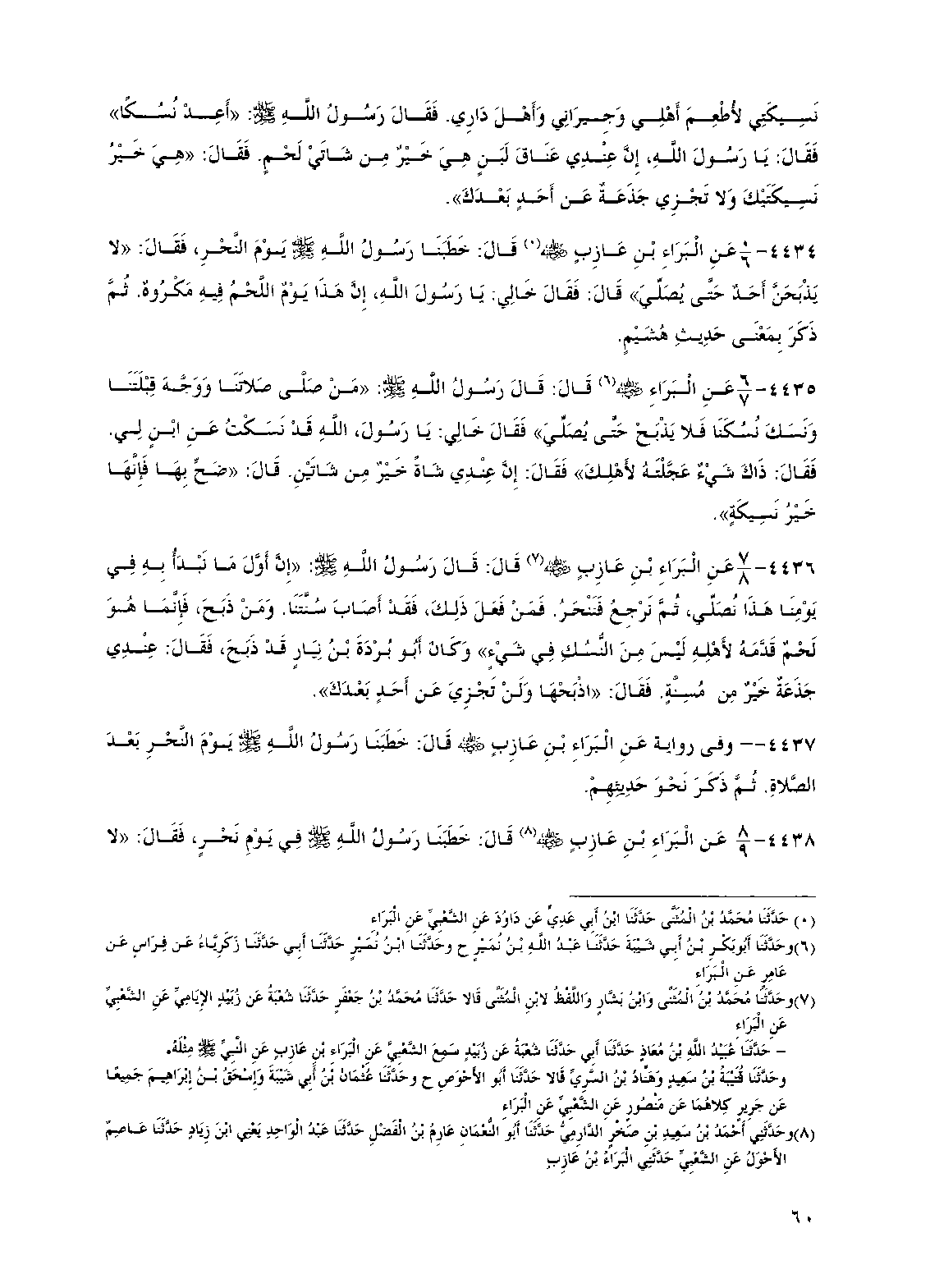 4436 - عن البراء بن عازب رضي الله عنه قال: قال رسول الله صلى الله عليه وسلم: "إن أول ما نبدأ به في يومنا هذا نصلي، ثم نرجع فننحر. فمن فعل ذلك، فقد أصاب سنتنا. ومن ذبح، فإنما هو لحم قدمه لأهله ليس من النسك في شيء" وكان أبو بردة بن نيار قد ذبح، فقال: عندي جذعة خير من مسنة. فقال: "اذبحها ولن تجزي عن أحد بعدك".