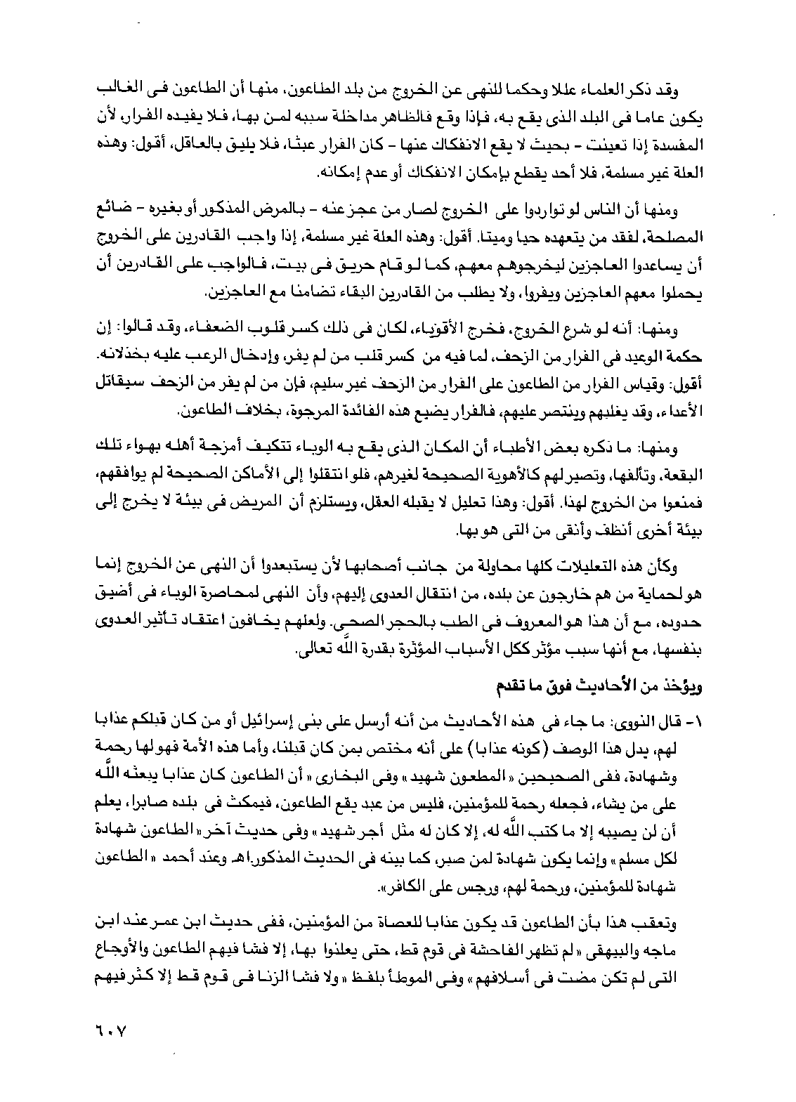 وكأن هذه التعليلات كلها محاولة من جانب أصحابها لأن يستبعدوا أن النهي عن الخروج إنما هو لحماية من هم خارجون عن بلده، من انتقال العدوى إليهم، وأن النهي لمحاصرة الوباء في أضيق حدوده، مع أن هذا هو المعروف في الطب بالحجر الصحي. ولعلهم يخافون اعتقاد تأثير العدوى بنفسها، مع أنها سبب مؤثر ككل الأسباب المؤثرة بقدرة الله تعالى.