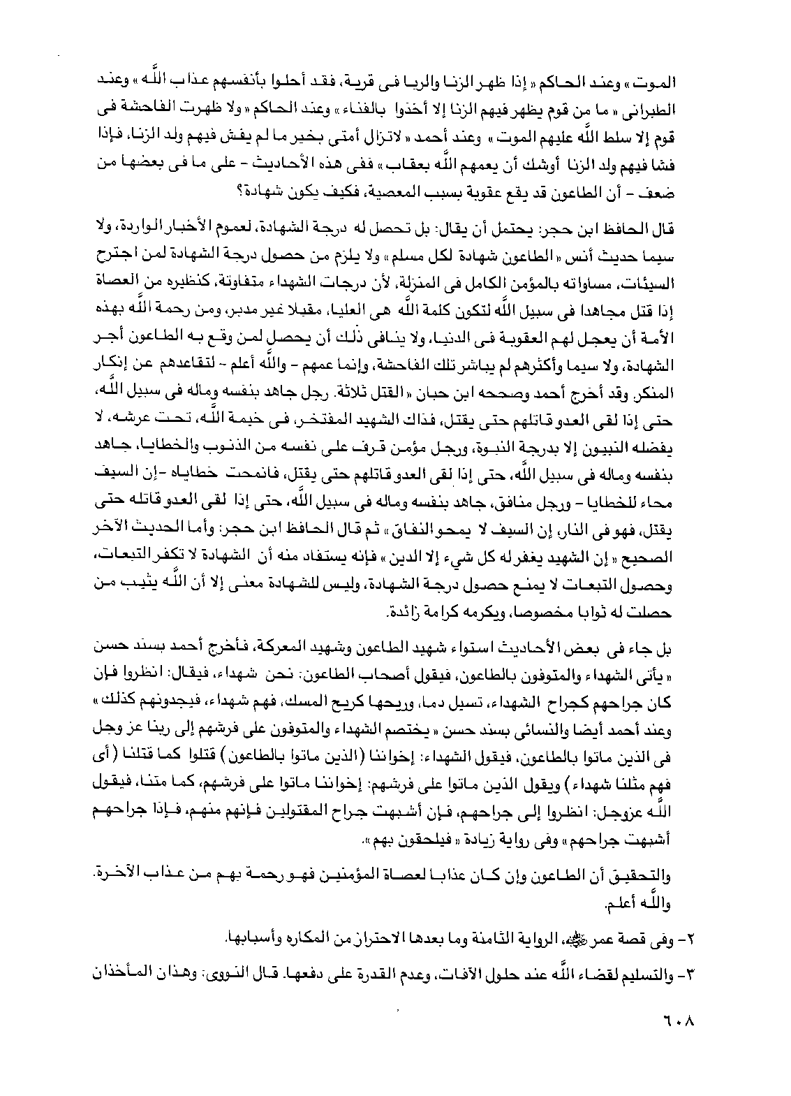 بل جاء في بعض الأحاديث استواء شهيد الطاعون وشهيد المعركة، فأخرج أحمد بسند حسن "يأتي الشهداء والمتوفون بالطاعون، فيقول أصحاب الطاعون: نحن شهداء، فيقال: انظروا فإن كان جراحهم كجراح الشهداء، تسيل دماً، وريحها كريح المسك، فهم شهداء، فيجدونهم كذلك" وعند أحمد أيضاً والنسائي بسند حسن "يختصم الشهداء والمتوفون على فرشهم إلى ربنا عز وجل في الذين ماتوا بالطاعون، فيقول الشهداء: إخواننا (الذين ماتوا بالطاعون) قتلوا كما قتلنا (أي فهم مثلنا شهداء) ويقول الذين ماتوا على فرشهم: إخواننا ماتوا على فرشهم، كما متنا، فيقول الله عز وجل: انظروا إلى جراحهم، فإن أشبهت جراح المقتولين فإنهم منهم، فإذا جراحهم أشبهت جراحهم" وفي رواية زيادة "فيلحقون بهم".