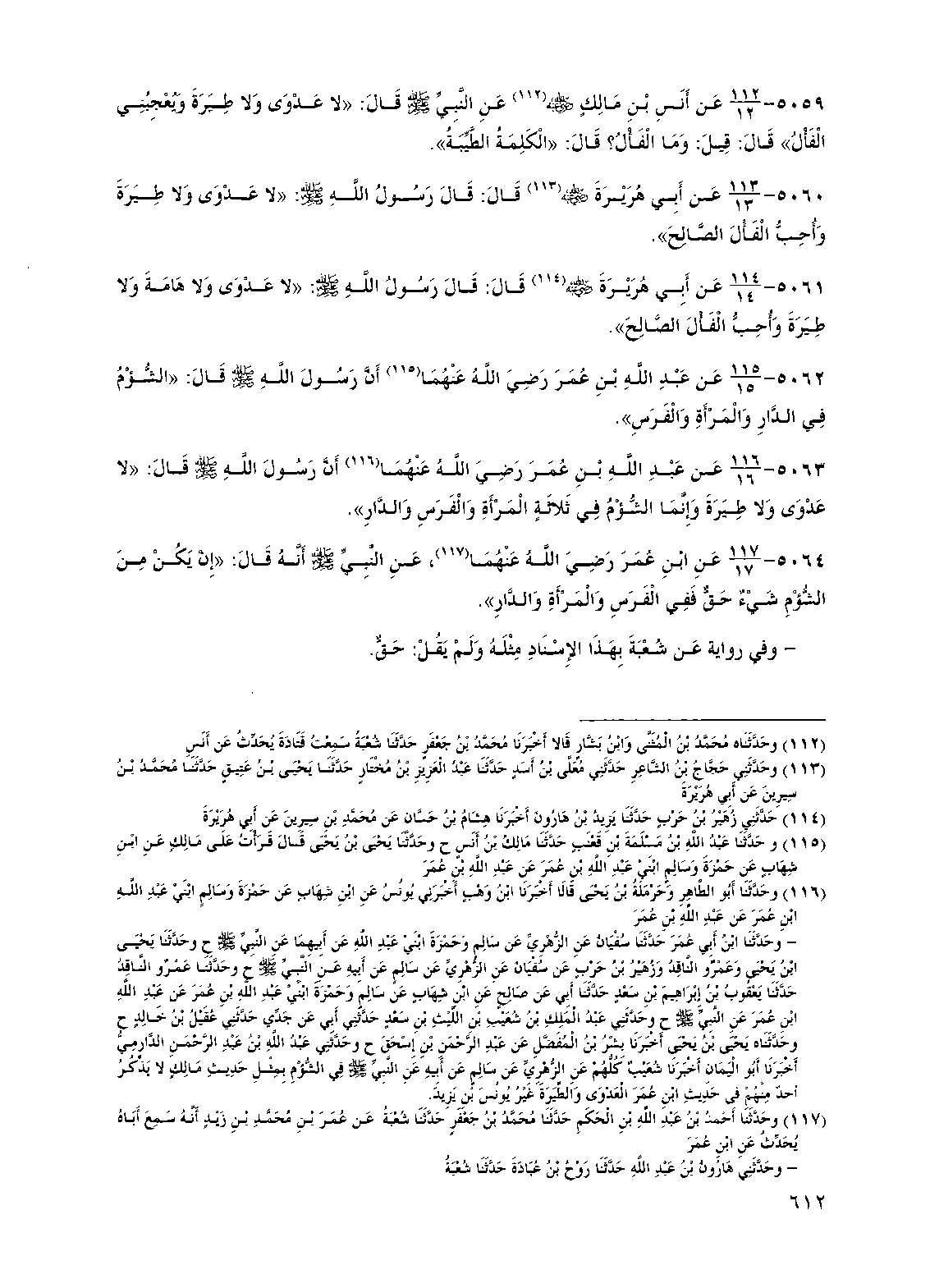 5062 - عن عبد الله بن عمر رضي الله عنهما أن رسول الله صلى الله عليه وسلم قال: "الشؤم في الدار والمرأة والفرس".