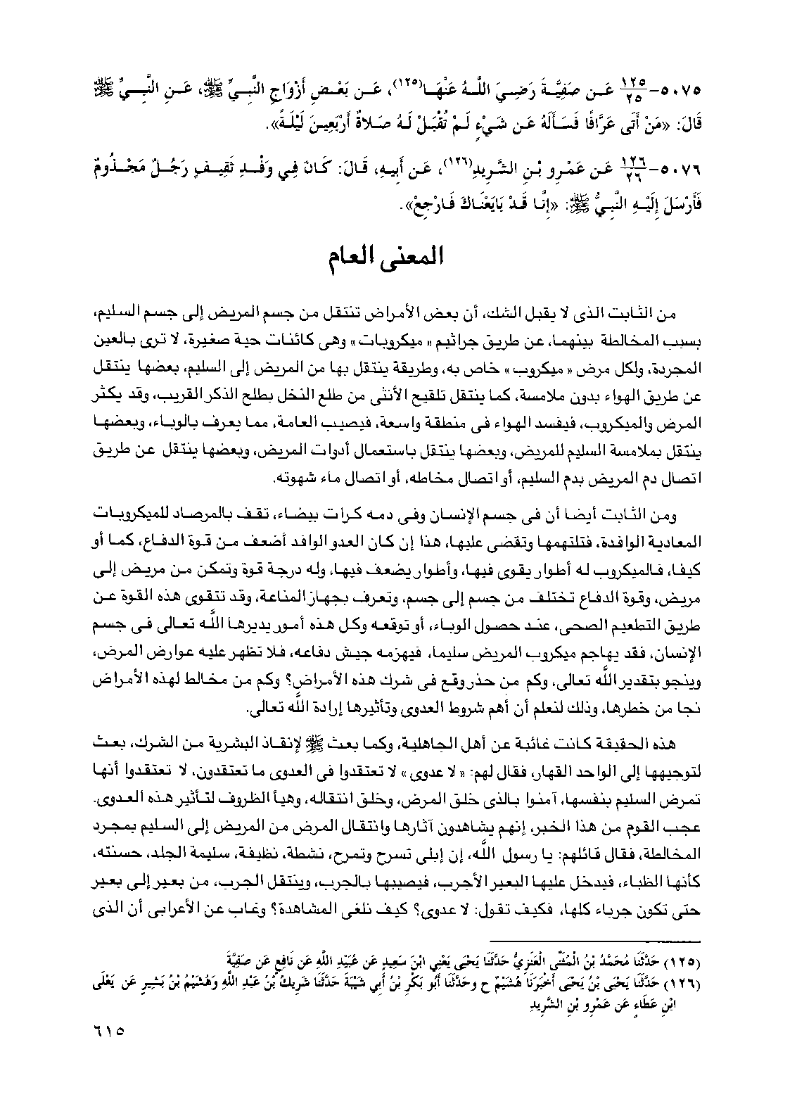 من الثابت الذي لا يقبل الشك، أن بعض الأمراض تنتقل من جسم المريض إلى جسم السليم، بسبب المخالطة بينهما، عن طريق جراثيم "ميكروبات" وهي كائنات حية صغيرة، لا ترى بالعين المجردة، ولكل مرض "ميكروب" خاص به، وطريقة ينتقل بها من المريض إلى السليم، بعضها ينتقل عن طريق الهواء بدون ملامسة، كما ينتقل تلقيح الأنثى من طلع النخل بطلع الذكر القريب، وقد يكثر المرض والميكروب، فيفسد الهواء في منطقة واسعة، فيصيب العامة، مما يعرف بالوباء، وبعضها ينتقل بملامسة السليم للمريض، وبعضها ينتقل باستعمال أدوات المريض، وبعضها ينتقل عن طريق اتصال دم المريض بدم السليم، أو اتصال مخاطه، أو اتصال ماء شهوته.