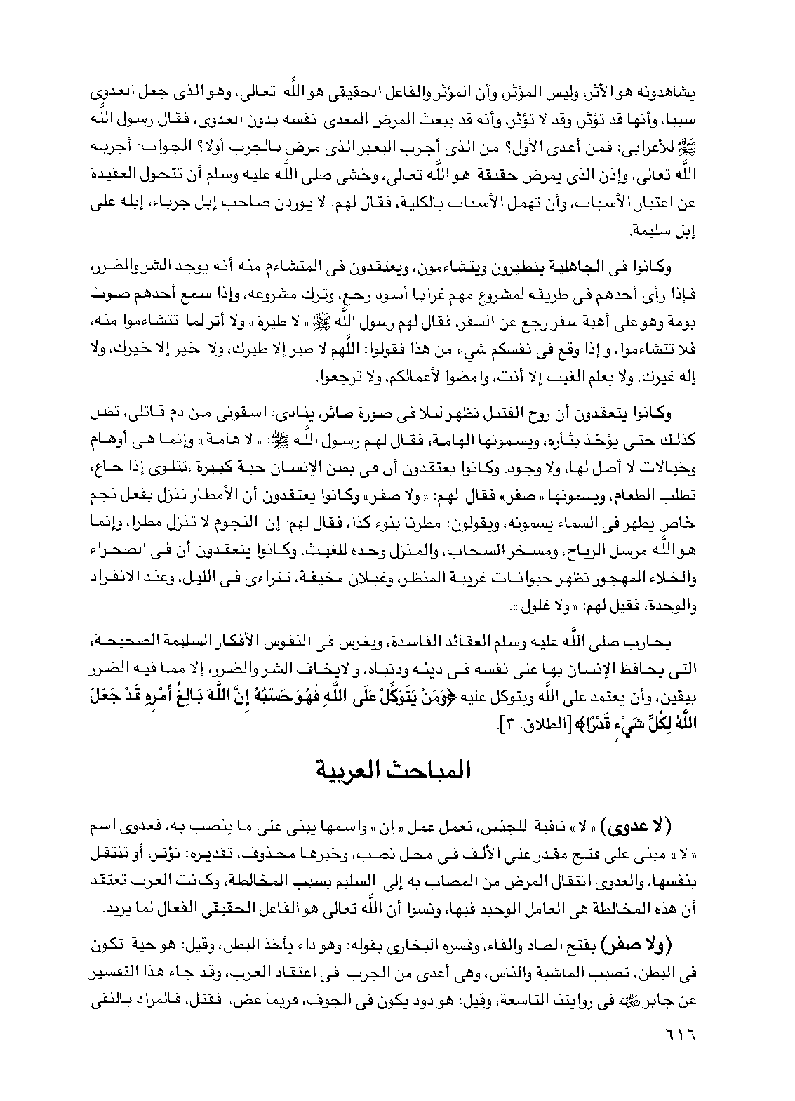 (لا عدوى) "لا" نافية للجنس، تعمل عمل "إن" واسمها يبنى على ما ينصب به، فعدوى اسم "لا" مبني على فتح مقدر على الألف في محل نصب، وخبرها محذوف، تقديره: تؤثر، أو تنتقل بنفسها، والعدوى انتقال المرض من المصاب به إلى السليم بسبب المخالطة، وكانت العرب تعتقد أن هذه المخالطة هي العامل الوحيد فيها، ونسوا أن الله تعالى هو الفاعل الحقيقي الفعال لما يريد.