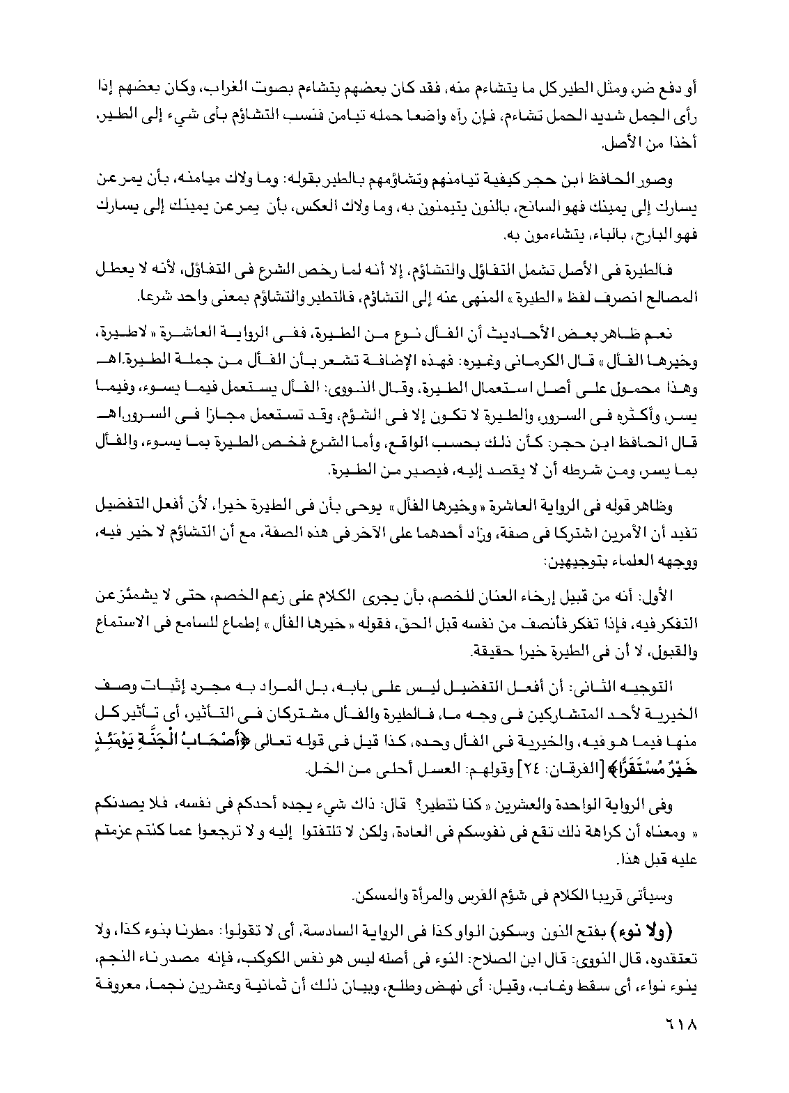 التوجيه الثاني: أن أفعل التفضيل ليس على بابه، بل المراد به مجرد إثبات وصف الخيرية لأحد المتشاركين في وجه ما، فالطيرة والفأل مشتركان في التأثير، أي تأثير كل منها فيما هو فيه، والخبرية في الفأل وحده، كذا قيل في قوله تعالى {أصحاب الجنة يومئذ خير مستقراً} [الفرقان: 24] وقولهم: العسل أحلى من الخل.