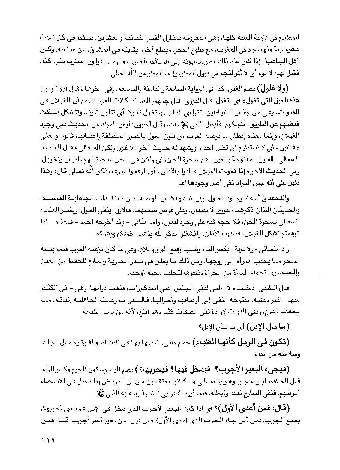 (ولا غلول) بضم الغين، كذا في الرواية السابعة والثامنة والتاسعة، وفي آخرها "قال أبو الزبير: هذه الغول التي تغول" أي تتغول، قال النووي: قال جمهور العلماء: كانت العرب تزعم أن الغيلان في الفلوات، وهي من جنس الشياطين، تتراءى للناس، وتتغول تغولاً، أي تتلون تلوناً، وتتشكل تشكلاً، فتضلهم عن الطريق، فتهلكهم، فأبطل النبي صلى الله عليه وسلم ذلك، وقال آخرون: ليس المراد من الحديث نفي وجود الغيلان، وإنما معناه إبطال ما تزعمه العرب من تلون الغول بالصور المختلفة واغتيالها، قالوا: ومعنى "لا غول" أي لا تستطيع أن تضل أحداً، ويشهد له حديث آخر "لا غول ولكن السعالى" قال العلماء: السعالى بالسين المفتوحة والعين، هم سحرة الجن، أي ولكن في الجن سحرة، لهم تلبيس وتخييل، وفي الحديث الآخر "إذا تغولت الغيلان فنادوا بالأذان" أي ارفعوا شرها بذكر الله تعالى قال: وهذا دليل على أنه ليس المراد نفي أصل وجودها. اهـ
