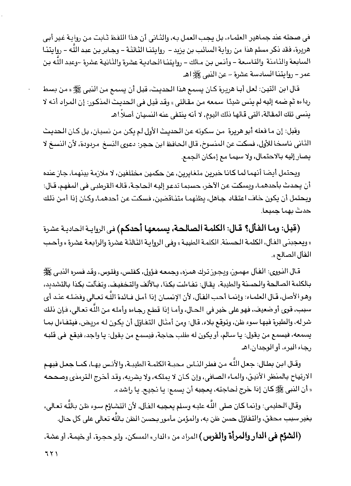 (قيل: وما الفأل؟ قال: الكلمة الصالحة، يسمعها أحدكم) في الرواية الحادية عشرة "ويعجبني الفأل، الكلمة الحسنة. الكلمة الطيبة" وفي الرواية الثالثة عشرة والرابعة عشرة "وأحب الفأل الصالح".