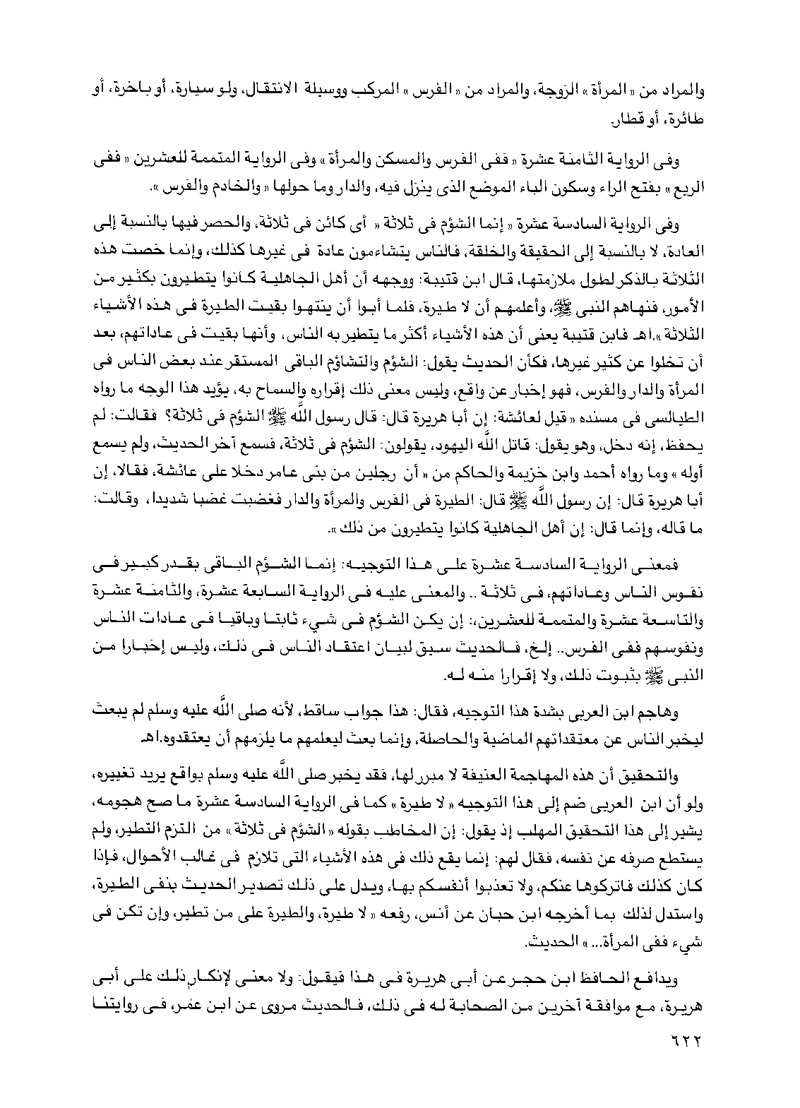 وفي الرواية السادسة عشرة "إنما الشؤم في ثلاثة" أي كائن في ثلاثة، والحصر فيها بالنسبة إلى العادة، لا بالنسبة إلى الحقيقة والخلقة، فالناس يتشاءمون عادة في غيرها كذلك، وإنما خصت هذه الثلاثة بالذكر لطول ملازمتها، قال ابن قتيبة: ووجهه أن أهل الجاهلية كانوا يتطيرون بكثير من الأمور، فنهاهم النبي صلى الله عليه وسلم، وأعلمهم أن لا طيرة، فلما أبوا أن ينتهوا بقيت الطيرة في هذه الأشياء الثلاثة". اهـ فابن قتيبة يعني أن هذه الأشياء أكثر ما يتطير به الناس، وأنها بقيت في عاداتهم، بعد أن تخلوا عن كثير غيرها، فكأن الحديث يقول: الشؤم والتشاؤم الباقي المستقر عند بعض الناس في المرأة والدار والفرس، فهو إخبار عن واقع، وليس معنى ذلك إقراره والسماح به، يؤيد هذا الوجه ما رواه الطيالسي في مسنده "قيل لعائشة: إن أبا هريرة قال: قال رسول الله صلى الله عليه وسلم الشؤم في ثلاثة؟ فقالت: لم يحفظ، إنه دخل، وهو يقول: قاتل الله اليهود، يقولون: الشؤم في ثلاثة، فسمع آخر الحديث، ولم يسمع أوله" وما رواه أحمد وابن خزيمة والحاكم من "أن رجلين من بني عامر دخلا على عائشة، فقالا، إن أبا هريرة قال: إن رسول الله صلى الله عليه وسلم قال: الطيرة في الفرس والمرأة والدار فغضبت غضباً شديداً، وقالت: ما قاله، وإنما قال: إن أهل الجاهلية كانوا يتطيرون من ذلك".