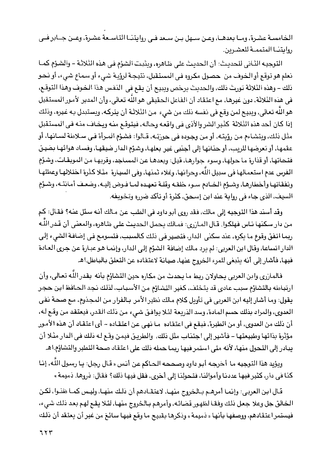 وقد أسند هذا التوجيه إلى مالك، فقد روى أبو داود في الطب عن مالك أنه سئل عنه؟ فقال: كم من دار سكنها ناس فهلكوا. قال المازري: فمالك يحمل الحديث على ظاهره، والمعنى أن قدر الله ربما اتفق وقوع ما يكره، عند سكنى الدار، فتصير في ذلك كالسبب، فتسومح في إضافة الشيء إلى الدار اتساعاً، وقال ابن العربي: لم يرد مالك إضافة الشؤم إلى الدار، وإنما هو عبارة عن جري العادة فيها، فأشار إلى أنه ينبغي للمرء الخروج عنها، صيانة لاعتقاده عن التعلق بالباطل. اهـ