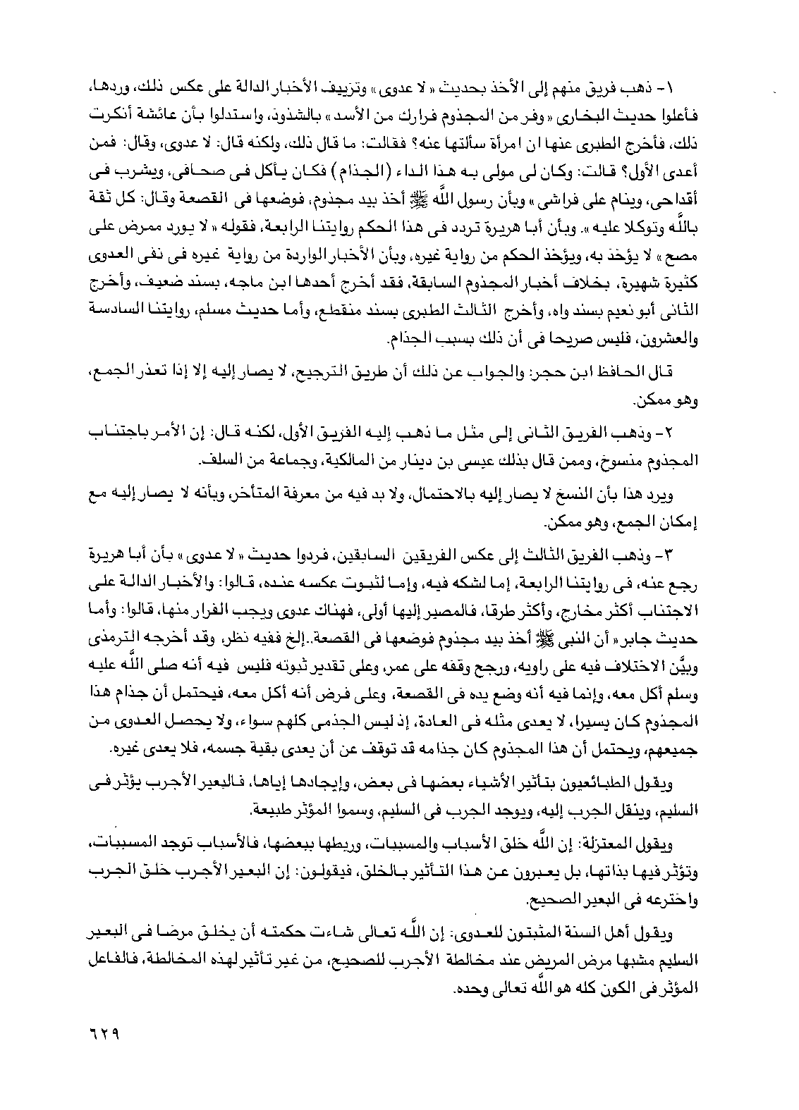 1 - ذهب فريق منهم إلى الأخذ بحديث "لا عدوى" وتزييف الأخبار الدالة على عكس ذلك، وردها، فأعلوا حديث البخاري "وفر من المجذوم فرارك من الأسد" بالشذوذ، واستدلوا بأن عائشة أنكرت ذلك، فأخرج الطبري عنها أن امرأة سألتها عنه؟ فقالت: ما قال ذلك، ولكنه قال: لا عدوى، وقال: فمن أعدى الأول؟ قالت: وكان لي مولى به هذا الداء (الجذام) فكان يأكل في صحافي، ويشرب في أقداحي، وينام على فراشي" وبأن رسول الله صلى الله عليه وسلم أخذ بيد مجذوم، فوضعها في القصعة وقال: كل ثقة بالله وتوكلا عليه". وبأن أبا هريرة تردد في هذا الحكم روايتنا الرابعة، فقوله "لا يورد ممرض على مصح" لا يؤخذ به، ويؤخذ الحكم من رواية غيره، وبأن الأخبار الواردة من رواية غيره في نفي العدوى كثيرة شهيرة، بخلاف أخبار المجذوم السابقة، فقد أخرج أحدها ابن ماجه، بسند ضعيف، وأخرج الثاني أبو نعيم بسند واه، وأخرج الثالث الطبري بسند منقطع، وأما حديث مسلم، روايتنا السادسة والعشرون، فليس صريحاً في أن ذلك بسبب الجذام.