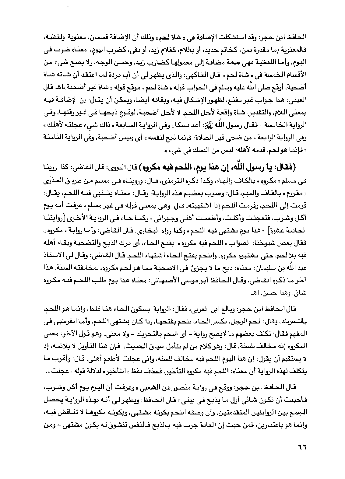 الحافظ ابن حجر: وقد استشكلت الإضافة في "شاة لحم" وذلك أن الإضافة قسمان، معنوية ولفظية، فالمعنوية إما مقدرة بمن، كخاتم حديد، أو باللام، كغلام زيد، أو بفي، كضرب اليوم، معناه ضرب في اليوم، وأما اللفظية فهي صفة مضافة إلى معمولها كضارب زيد، وحسن الوجه، ولا يصح شيء من الأقسام الخمسة في "شاة لحم" قال الفاكهي: والذي يظهر لي أن أبا بردة لما اعتقد أن شاته شاة أضحية، أوقع صلى الله عليه وسلم في الجواب قوله "شاة لحم" موقع قوله "شاة غير أضحية" اهـ قال العيني: هذا جواب غير مقنع، لظهور الإشكال فيه، وبقائه أيضاً، ويمكن أن يقال: إن الإضافة فيه بمعنى اللام، والتقدير: شاة واقعة لأجل اللحم، لا لأجل أضحية، لوقوع ذبحها في غير وقتها، وفي الرواية الخامسة "فقال رسول الله صلى الله عليه وسلم: أعد نسكاً" وفي الرواية السابعة "ذاك شيء عجلته لأهلك" وفي الرواية الرابعة "من ضحى قبل الصلاة: فإنما ذبح لنفسه" أي وليس أضحية، وفي الرواية الثامنة "فإنما هو لحم، قدمه لأهله: ليس من النسك في شيء".