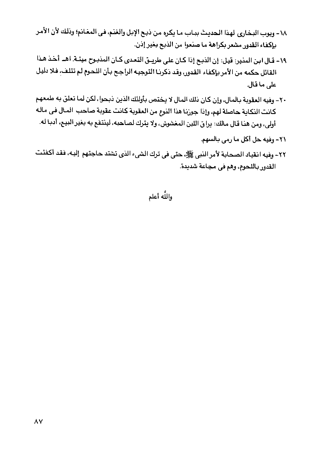 19 - قال ابن المنير: قيل: إن الذبح إذا كان على طريق التعدي كان المذبوح ميتة. اهـ أخذ هذا القائل حكمه من الأمر بإكفاء القدور، وقد ذكرنا التوجيه الراجح بأن اللحوم لم تتلف، فلا دليل على ما قال.