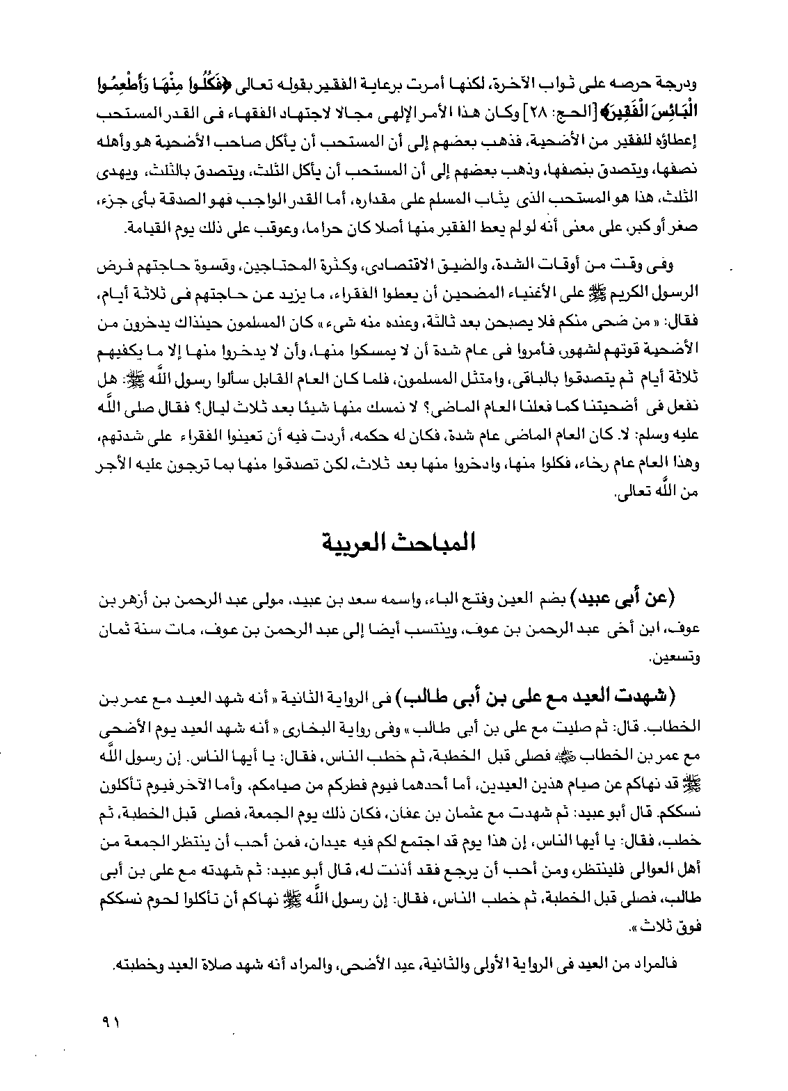 ودرجة حرصه على ثواب الآخرة، لكنها أمرت برعاية الفقير بقوله تعالى {فكلوا منها وأطعموا البائس الفقير} [الحج: 28] وكان هذا الأمر الإلهي مجالاً لاجتهاد الفقهاء في القدر المستحب إعطاؤه للفقير من الأضحية، فذهب بعضهم إلى أن المستحب أن يأكل صاحب الأضحية هو وأهله نصفها، ويتصدق بنصفها، وذهب بعضهم إلى أن المستحب أن يأكل الثلث، ويتصدق بالثلث، ويهدي الثلث، هذا هو المستحب الذي يثاب المسلم على مقداره، أما القدر الواجب فهو الصدقة بأي جزء، صغر أو كبر، على معنى أنه لو لم يعط الفقير منها أصلاً كان حراماً، وعوقب على ذلك يوم القيامة.