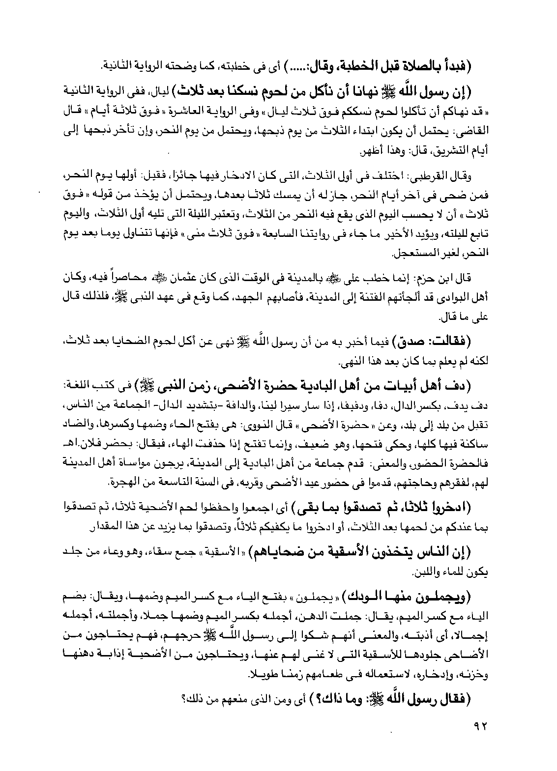 (دف أهل أبيات من أهل البادية حضرة الأضحى، زمن النبي صلى الله عليه وسلم) في كتب اللغة: دف يدف، بكسر الدال، دفاً، ودفيفاً، إذا سار سيراً ليناً، والدافة -بتشديد الدال- الجماعة من الناس، تقبل من بلد إلى بلد، وعن "حضرة الأضحى" قال النووي: هي بفتح الحاء وضمها وكسرها، والضاد ساكنة فيها كلها، وحكي فتحها، وهو ضعيف، وإنما نفتح إذا حذفت الهاء، فيقال: بحضر فلان. اهـ فالحضرة الحضور، والمعنى: قدم جماعة من أهل البادية إلى المدينة، يرجون مواساة أهل المدينة لهم، لفقرهم وحاجتهم، قدموا في حضور عيد الأضحى وقربه، في السنة التاسعة من الهجرة.