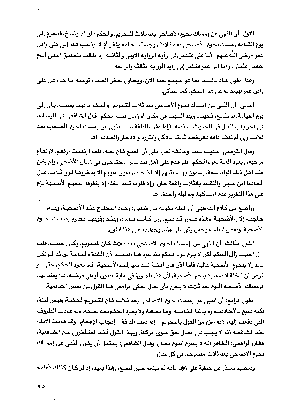 القول الرابع: أن النهي عن إمساك لحوم الأضاحي بعد ثلاث كان للتحريم، لحكمة، وليس لعلة، لكنه نسخ بالأحاديث، رواياتنا الخامسة وما بعدها، ولا يعود الحكم بعد نسخه، ولو عادت الظروف التي دفعت إليه، لأنه يلزم من القول بالتحريم -إذا دفت الدافة- إيجاب الإطعام، وقد قامت الأدلة عند الشافعية أنه لا يجب في المال حق سوى الزكاة، وبهذا القول أخذ المتأخرون من الشافعية، فقال الرافعي: الظاهر أنه لا يحرم اليوم بحال، وقال الشافعي: يحتمل أن يكون النهي عن إمساك لحوم الأضاحي بعد ثلاث منسوخاً، في كل حال.