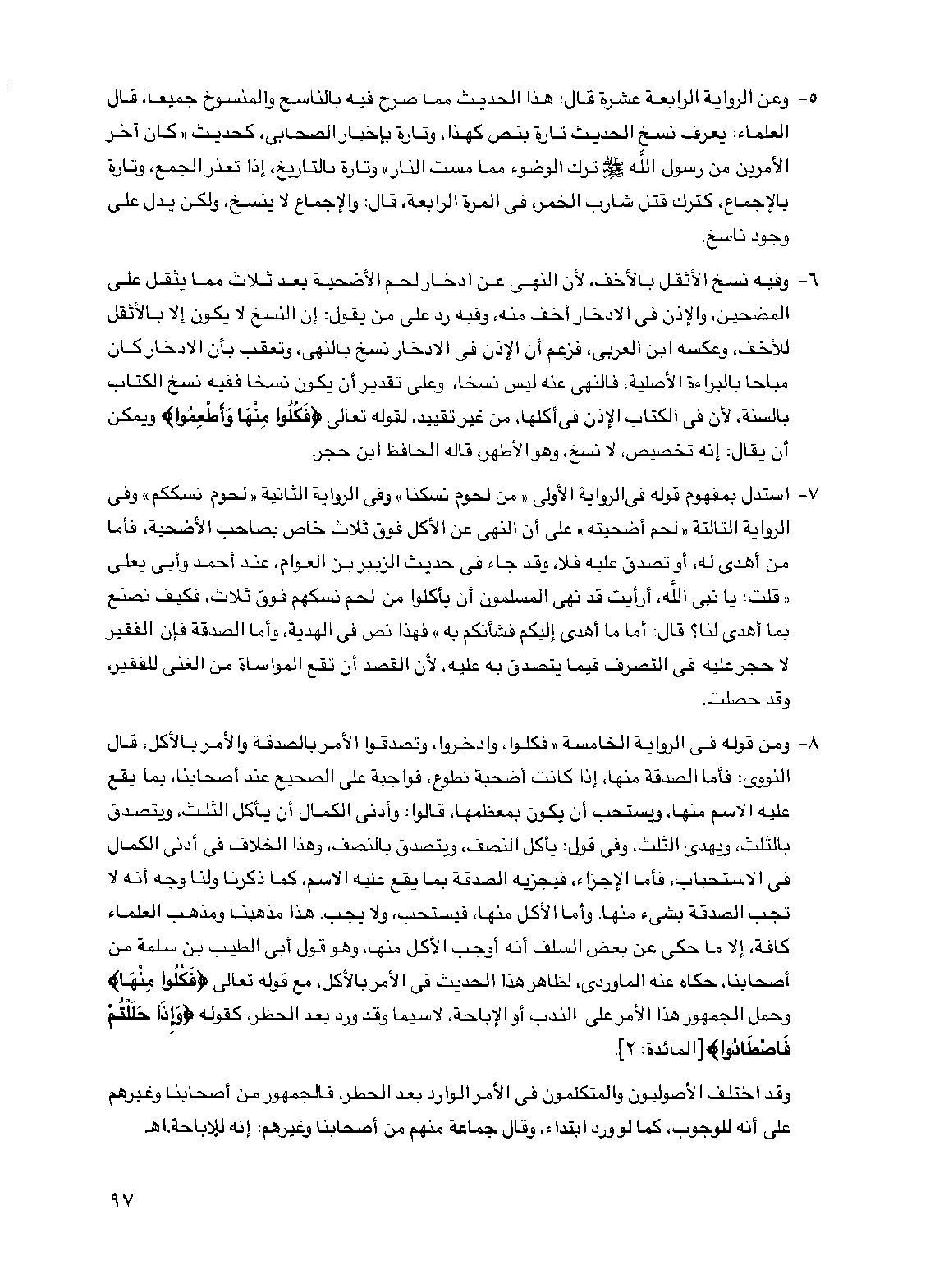 6 - وفيه نسخ الأثقل بالأخف، لأن النهي عن ادخار لحم الأضحية بعد ثلاث مما يثقل على المضحين، والإذن في الادخار أخف منه، وفيه رد على من يقول: إن النسخ لا يكون إلا بالأثقل للأخف، وعكسه ابن العربي، فزعم أن الإذن في الادخار نسخ بالنهي، وتعقب بأن الادخار كان مباحاً بالبراءة الأصلية، فالنهي عنه ليس نسخاً، وعلى تقدير أن يكون نسخاً ففيه نسخ الكتاب بالسنة، لأن في الكتاب الإذن في أكلها، من غير تقييد، لقوله تعالى {فكلوا منها وأطعموا} ويمكن أن يقال: إنه تخصيص، لا نسخ، وهو الأظهر، قاله الحافظ ابن حجر.