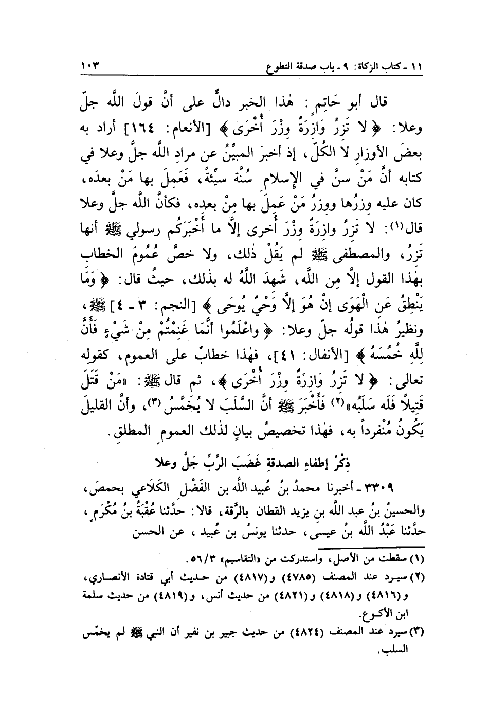 قَالَ أَبُو حَاتِمٍ: هَذَا الْخَبَرُ دَالٌ عَلَى أن قول الله جل وعلا: {وَلا تَزِرُ وَازِرَةٌ وِزْرَ أُخْرَى} (الأنعام: من الآية164) أَرَادَ بِهِ بَعْضَ الْأَوْزَارِ لَا الْكَلَّ، إِذْ أَخْبَرَ الْمُبَيِّنُ عَنْ مُرَادِ اللَّهِ جَلَّ وَعَلَا فِي كِتَابِهِ أَنَّ مَنْ سَنَّ فِي الْإِسْلَامِ سنة سيئة، فعمل بها من بعده، كان عَلَيْهِ وِزْرُهَا وَوِزْرُ مَنْ عَمِلَ بِهَا مِنْ بَعْدِهِ، فَكَأَنَّ اللَّهَ جَلَّ وَعَلَا قَالَ (1) : لَا تَزِرُ وَازِرَةٌ وِزْرَ أُخْرَى إِلَّا مَا أَخْبَرَكُمْ رَسُولِي صَلَّى اللَّهُ عَلَيْهِ وَسَلَّمَ أَنَّهَا تَزِرُ، وَالْمُصْطَفَى صَلَّى اللَّهُ عَلَيْهِ وَسَلَّمَ لَمْ يَقُلْ ذَلِكَ، وَلَا خَصَّ عُمُومَ الْخِطَابِ بِهَذَا الْقَوْلِ إِلَّا مِنَ اللَّهِ، شَهِدَ اللَّهُ لَهُ بِذَلِكَ، حَيْثُ قَالَ: {وَمَا يَنْطِقُ عَنِ الْهَوَى إِنْ هُوَ إِلَّا وَحْيٌ يُوحَى} (لنجم:4) صَلَّى اللَّهُ عَلَيْهِ وَسَلَّمَ، وَنَظِيرُ هَذَا قَوْلُهُ جَلَّ وَعَلَا: {وَاعْلَمُوا أَنَّمَا غَنِمْتُمْ مِنْ شَيْءٍ فَأَنَّ لِلَّهِ خُمُسَهُ} (لأنفال: من الآية41) فهذا خطاب على العموم، كقوله تعالى: {وَلا تَزِرُ وَازِرَةٌ وِزْرَ أُخْرَى} ، ثُمَّ قَالَ صَلَّى اللَّهُ عَلَيْهِ وَسَلَّمَ: "مَنْ قَتَلَ قَتِيلًا فَلَهُ سَلَبُهُ" (2) فَأَخْبَرَ صَلَّى اللَّهُ عَلَيْهِ وَسَلَّمَ أَنَّ السَّلَبَ لَا يُخَمَّسُ (3) ، وَأَنَّ الْقَلِيلَ يَكُونُ مُنْفَرِدًا بِهِ، فَهَذَا تَخْصِيصُ بَيَانٍ لذلك العموم المطلق.