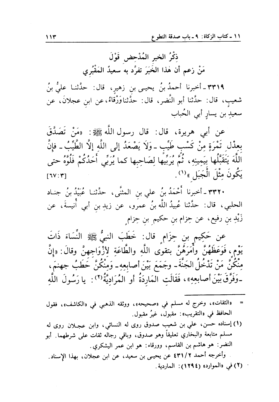 3320 - أَخْبَرَنَا أَحْمَدُ بْنُ عَلِيِّ بْنِ الْمُثَنَّى، حَدَّثَنَا عُبَيْدُ بْنُ جَنَّادٍ الْحَلَبِيُّ، قَالَ: حَدَّثَنَا عُبَيْدُ اللَّهِ بْنُ عَمْرٍو، عَنْ زَيْدِ بْنِ أَبِي أُنَيْسَةَ، عَنْ زَيْدِ بْنِ رُفَيْعٍ، عَنْ حِزَامِ بْنِ حَكِيمِ بْنِ حِزَامٍ