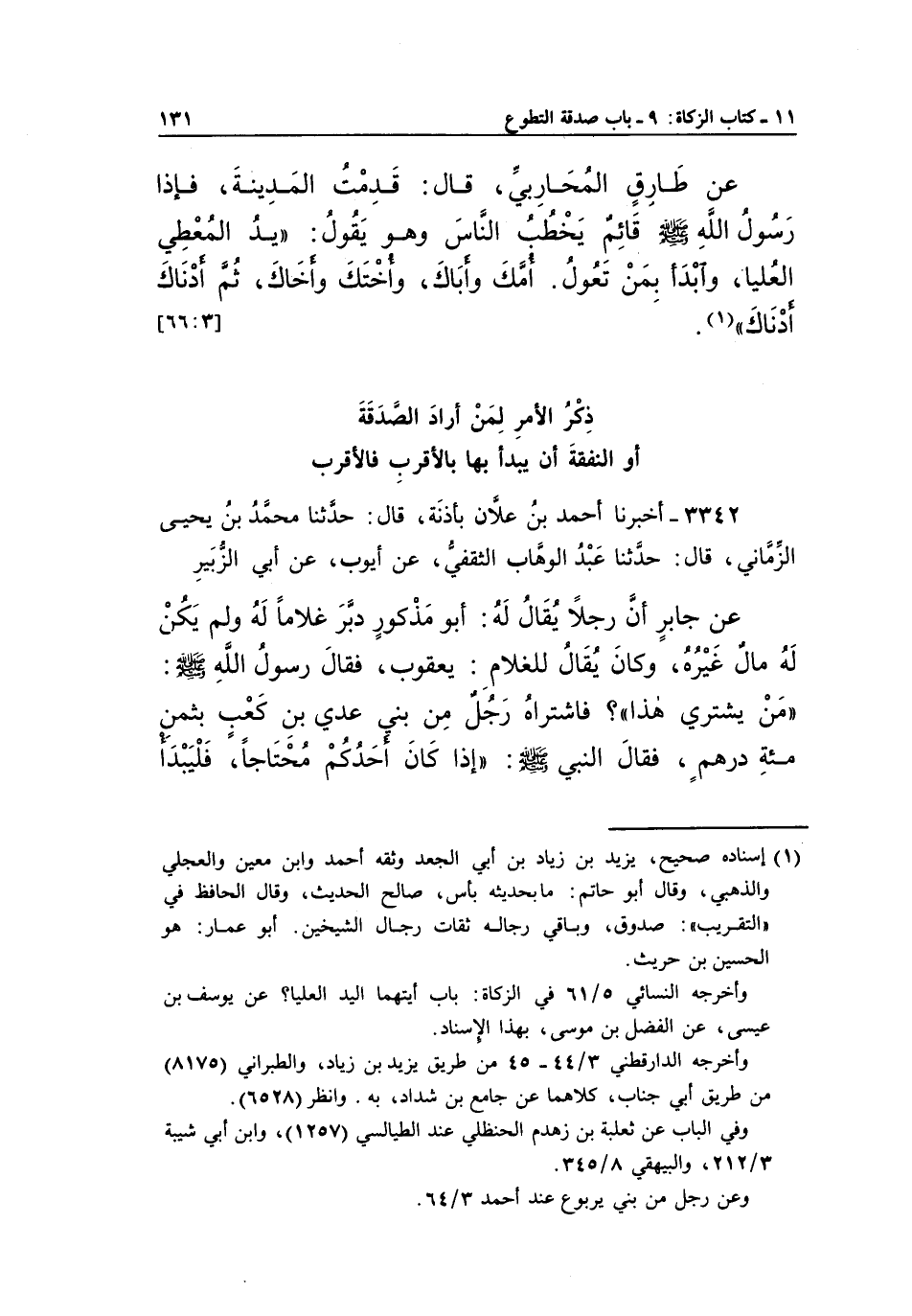 عَنْ جَابِرٍ أَنَّ رَجُلًا يُقَالُ لَهُ: أَبُو مَذْكُورٍ دَبَّرَ غُلَامًا لَهُ وَلَمْ يَكُنْ لَهُ مَالٌ غَيْرُهُ، وَكَانَ يُقَالُ لِلْغُلَامِ: يَعْقُوبُ، فَقَالَ رَسُولُ اللَّهِ صَلَّى اللَّهُ عَلَيْهِ وَسَلَّمَ: "مَنْ يَشْتَرِي هَذَا"؟ فَاشْتَرَاهُ رَجُلٌ مِنْ بَنِي عَدِيِّ بْنِ كَعْبٍ بِثَمَنِ مِائَةِ دِرْهَمٍ، فَقَالَ النَّبِيُّ صَلَّى اللَّهُ عَلَيْهِ وَسَلَّمَ: "إِذَا كَانَ أحدكم محتاجا، فليبدأذكر الْأَمْرِ لِمَنْ أَرَادَ الصَّدَقَةَ أَوِ النَّفَقَةَ أَنْ يَبْدَأَ بِهَا بِالْأَقْرَبِ فَالْأَقْرَبِ