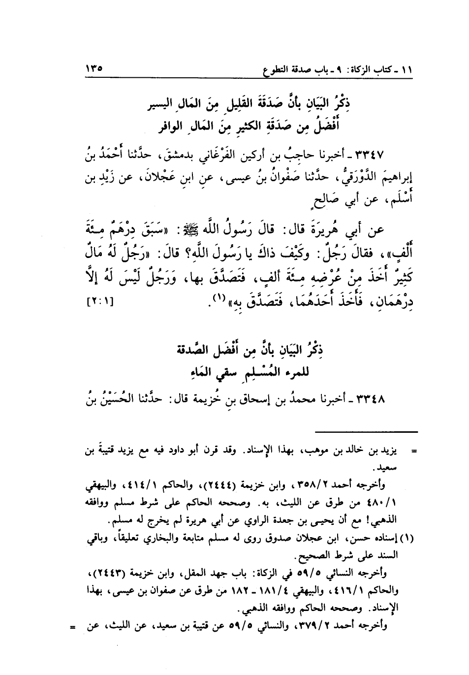 3348 - أَخْبَرَنَا مُحَمَّدُ بْنُ إِسْحَاقَ بْنِ خُزَيْمَةَ قَالَ: حدثنا الحسين بنذكر الْبَيَانِ بِأَنَّ مِنْ أَفْضَلِ الصَّدَقَةِ لِلْمَرْءِ الْمُسْلِمِ سَقْيَ الْمَاءَ