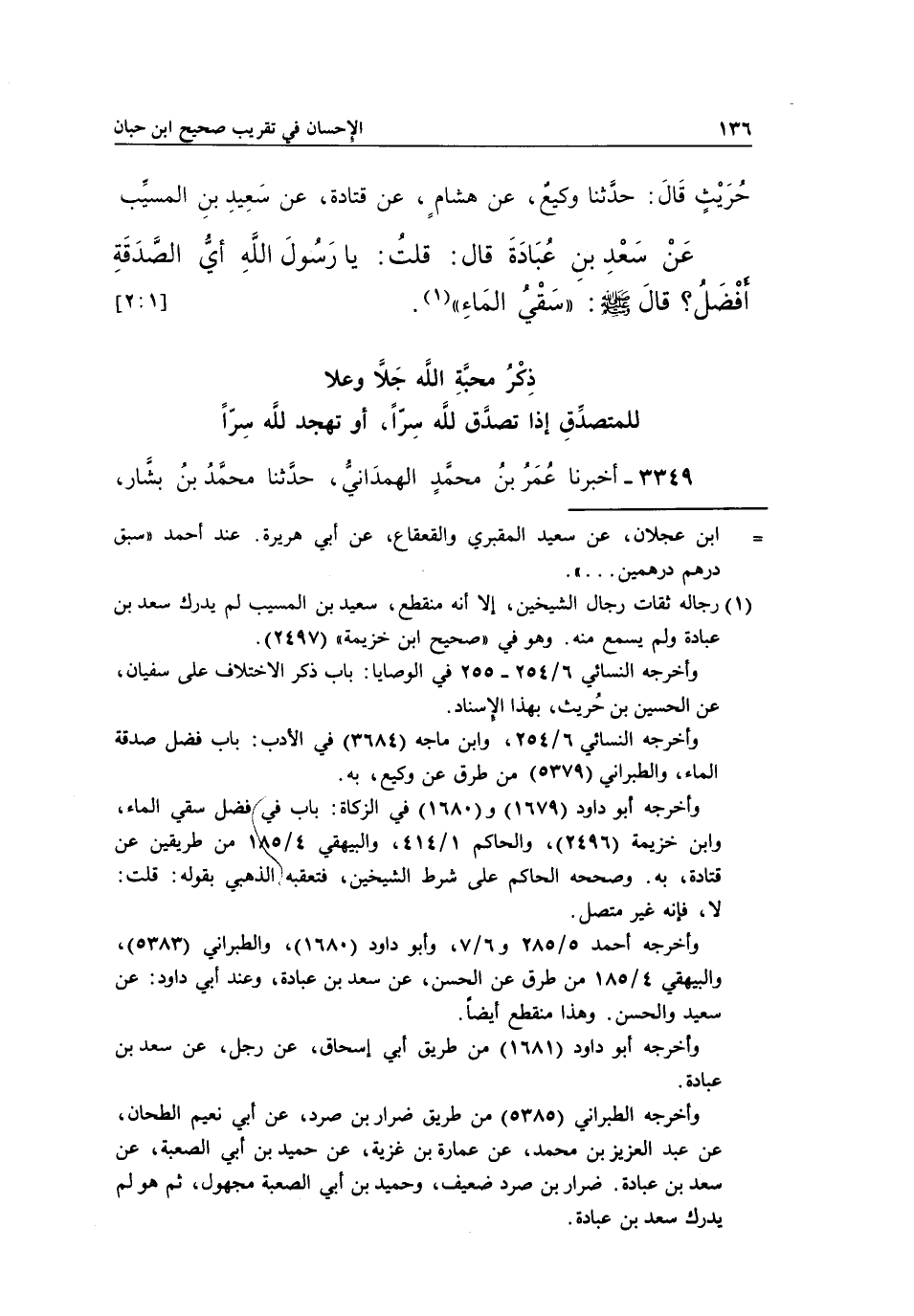 3349 - أَخْبَرَنَا عُمَرُ بْنُ مُحَمَّدٍ الْهَمْدَانِيُّ، حَدَّثَنَا مُحَمَّدُ بن بشار، ذكر محبة الله جلا وَعَلَا لِلْمُتَصَدِّقِ إِذَا تَصَدَّقَ لِلَّهِ سِرًّا، أَوْ تَهَجَّدَ لِلَّهِ سِرًّا