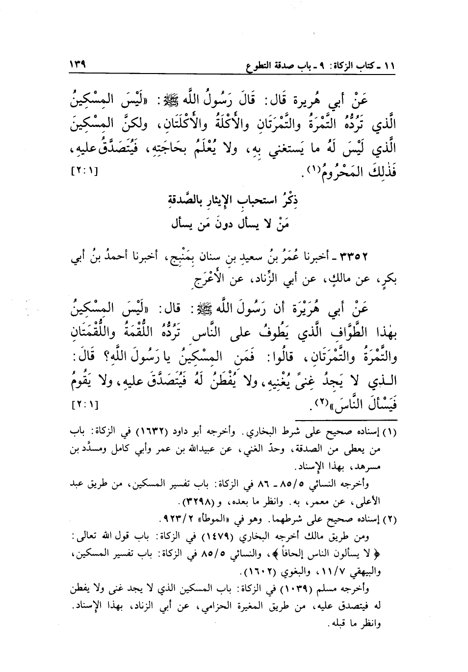 ومن طريق مالك أخرجه البخاري "1479" في الزكاة: باب قول الله تعالى: {لا يَسْأَلونَ النَّاسَ إِلْحَافاً} (البقرة: من الآية273) ، والنسائي 5/85 في الزكاة: باب تفسير المسكين، والبيهقي 7/11، والبغوي "1602".