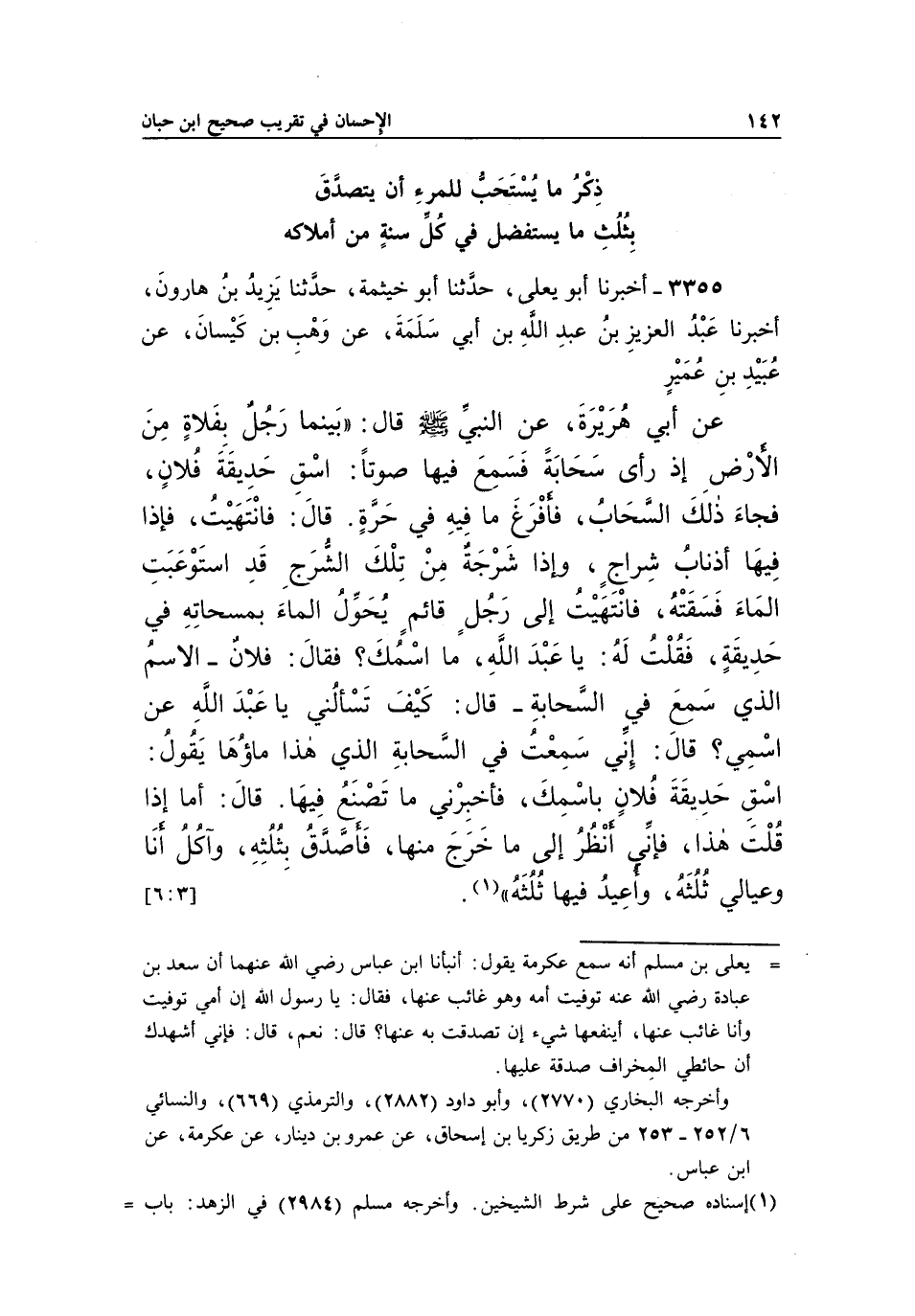 عَنْ أَبِي هُرَيْرَةَ، عَنِ النَّبِيِّ صَلَّى اللَّهُ عَلَيْهِ وَسَلَّمَ قَالَ: "بَيْنَمَا رَجُلٌ بِفَلَاةٍ مِنَ الْأَرْضِ إِذْ رَأَى سَحَابَةً فَسَمِعَ فِيهَا صَوْتًا: اسْقِ حَدِيقَةَ فُلَانٍ، فَجَاءَ ذَلِكَ السَّحَابُ، فَأَفْرَغَ مَا فِيهِ فِي حُرَّةٍ. قَالَ: فَانْتَهَيْتُ، فَإِذَا فِيهَا أَذْنَابُ شِرَاجٍ، وَإِذَا شَرْجَةٌ مِنْ تِلْكَ الشُّرَجِ قَدِ اسْتَوْعَبَتِ الْمَاءَ فَسَقَتْهُ، فَانْتَهَيْتُ إِلَى رَجُلٍ قَائِمٍ يَحُولُ الْمَاءَ بِمِسْحَاتِهِ فِي حَدِيقَةٍ، فَقُلْتُ لَهُ: يَا عَبْدَ اللَّهِ، مَا اسْمُكَ؟ فَقَالَ: فُلَانٌ -الِاسْمُ الَّذِي سَمِعَ فِيَ السَّحَابَةِ- قَالَ: كَيْفَ تَسْأَلُنِي يَا عَبْدَ اللَّهِ عَنِ اسْمِي؟ قَالَ: إِنِّي سَمِعْتُ فِيَ السَّحَابَةِ الَّذِي هَذَا مَاؤُهَا يَقُولُ: اسْقِ حَدِيقَةَ فُلَانٍ بِاسْمِكَ، فَأَخْبِرْنِي مَا تَصْنَعُ فِيهَا. قَالَ: أَمَا إِذَا قُلْتَ هَذَا، فَإِنِّي أَنْظُرُ إِلَى مَا خَرَجَ مِنْهَا، فَأَصَّدَقُ بِثُلُثِهِ، وَآكُلُ أَنَا وَعِيَالِي ثُلُثَهُ، وَأُعِيدُ فيها ثلثه" (1) .