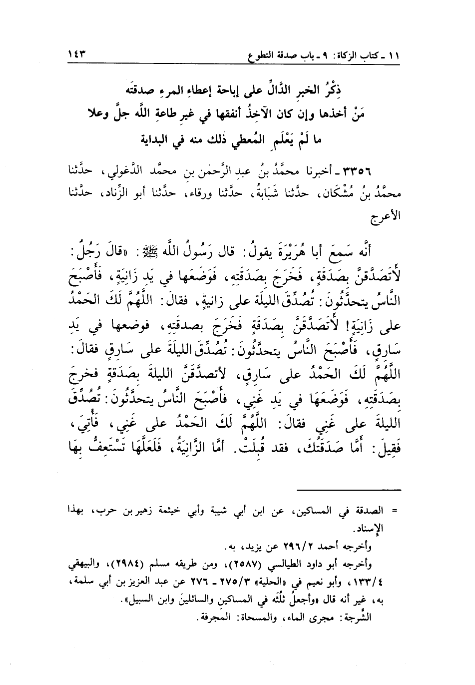 أَنَّهُ سَمِعَ أَبَا هُرَيْرَةَ يَقُولُ: قَالَ رَسُولُ اللَّهِ صَلَّى اللَّهُ عَلَيْهِ وَسَلَّمَ: "قَالَ رَجُلٌ: لَأَتَصَدَّقَنَّ بِصَدَقَةٍ، فَخَرَجَ بِصَدَقَتِهِ، فَوَضَعَهَا فِي يَدِ زَانِيَةٍ، فَأَصْبَحَ النَّاسُ يَتَحَدَّثُونَ: تُصُدِّقَ اللَّيْلَةَ عَلَى زَانِيَةٍ، فَقَالَ: اللَّهُمَّ لَكَ الْحَمْدُ عَلَى زَانِيَةٍ! لَأَتَصَدَّقَنَّ بِصَدَقَةٍ فَخَرَجَ بِصَدَقَتِهِ، فَوَضَعَهَا فِي يَدِ سَارِقٍ، فَأَصْبَحَ النَّاسُ يَتَحَدَّثُونَ: تُصُدِّقَ اللَّيْلَةَ عَلَى سَارِقٍ فَقَالَ: اللَّهُمَّ لَكَ الْحَمْدُ عَلَى سَارِقٍ، لَأَتَصَدَّقَنَّ اللَّيْلَةَ بِصَدَقَةٍ فَخَرَجَ بِصَدَقَتِهِ، فَوَضَعَهَا فِي يَدِ غَنِيٍّ، فَأَصْبَحَ النَّاسُ يَتَحَدَّثُونَ: تُصُدِّقَ اللَّيْلَةَ عَلَى غَنِيٍّ فَقَالَ: اللَّهُمَّ لَكَ الْحَمْدُ عَلَى غَنِيٍّ، فَأُتِيَ، فَقِيلَ: أَمَّا صَدَقَتُكَ، فَقَدْ قُبِلَتْ. أما الزانية، فلعلها تستعف بها.ذِكْرُ الْخَبَرِ الدَّالِّ عَلَى إِبَاحَةِ إِعْطَاءِ الْمَرْءِ صَدَقَتَهُ مَنْ أَخَذَهَا وَإِنْ كَانَ الْآخِذُ أَنْفَقَهَا فِي غَيْرِ طَاعَةِ اللَّهِ جَلَّ وَعَلَا مَا لَمْ يَعْلَمِ الْمُعْطِي ذَلِكَ مِنْهُ فِي الْبِدَايَةِ