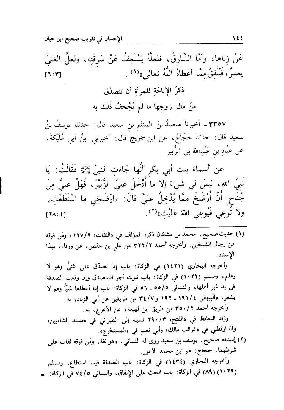 وأخرجه البخاري "1434" في الزكاة: باب الصدقة فيما استطاع، ومسلم "1029" "89" في الزكاة: باب الحث على الإنفاق، والنسائي 5/74 في الزكاة: باب الإحصاء في الصدقة، وفي "عشرة النساء" "311"، والبيهقي 4/187 6/60 من طرق عن حجاج الأعور، بهذا الإسناد.