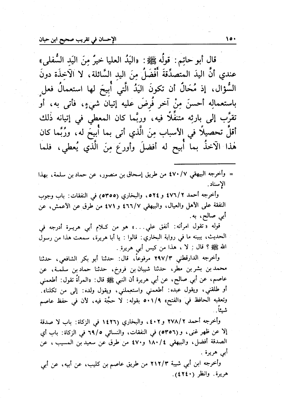 قَالَ أَبُو حَاتِمٍ: قَوْلُهُ صَلَّى اللَّهُ عَلَيْهِ وَسَلَّمَ: "الْيَدُ الْعُلْيَا خَيْرٌ مِنَ الْيَدِ السُّفْلَى" عِنْدِي أَنَّ الْيَدَ الْمُتَصَدِّقَةَ أَفْضَلُ مِنَ الْيَدِ السَّائِلَةِ، لَا الْآخِذَةِ دُونَ السُّؤَالِ، إِذْ مُحَالٌ أَنْ تَكُونَ الْيَدُ الَّتِي أُبِيحَ لَهَا اسْتِعْمَالُ فِعْلٍ بِاسْتِعْمَالِهِ أَحْسَنَ مِنْ آخَرَ فُرِضَ عَلَيْهِ إِتْيَانُ شَيْءٍ، فَأَتَى بِهِ، أَوْ تَقَرَّبَ إِلَى بَارِئِهِ مُتَنَفِّلًا فِيهِ، وَرُبَّمَا كَانَ الْمُعْطِي فِي إِتْيَانِهِ ذَلِكَ أَقَلَّ تَحْصِيلًا فِي الْأَسْبَابِ مِنَ الَّذِي أَتَى بِمَا أُبِيحَ لَهُ، وَرُبَّمَا كَانَ هذا الأخذ بما أبيح له أفضل وأروع مِنَ الَّذِي يُعْطِي، فَلَمَّا