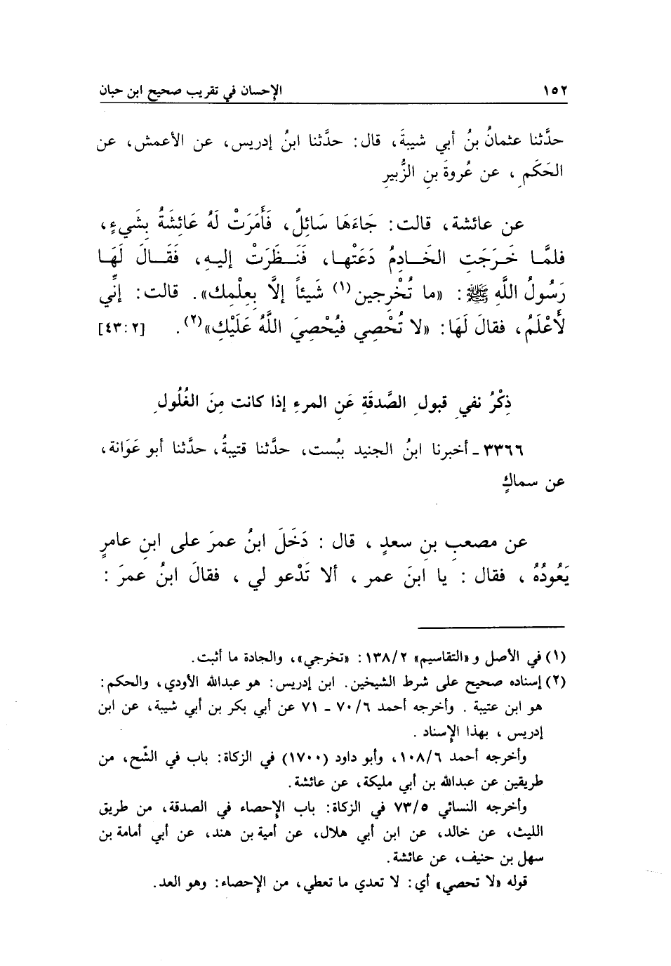 عَنْ عَائِشَةَ، قَالَتْ: جَاءَهَا سَائِلٌ، فَأَمَرَتْ لَهُ عَائِشَةُ بِشَيْءٍ، فَلَمَّا خَرَجَتِ الْخَادِمُ دَعَتْهَا، فَنَظَرَتْ إِلَيْهِ، فَقَالَ لَهَا رَسُولُ اللَّهِ صَلَّى اللَّهُ عَلَيْهِ وَسَلَّمَ: "مَا تُخْرِجِينَ (1) شَيْئًا إِلَّا بِعِلْمِكِ ".قَالَتْ: إِنِّي لَأَعْلَمُ، فَقَالَ لَهَا: "لا تحصي فيحصي الله عليك " (2) .