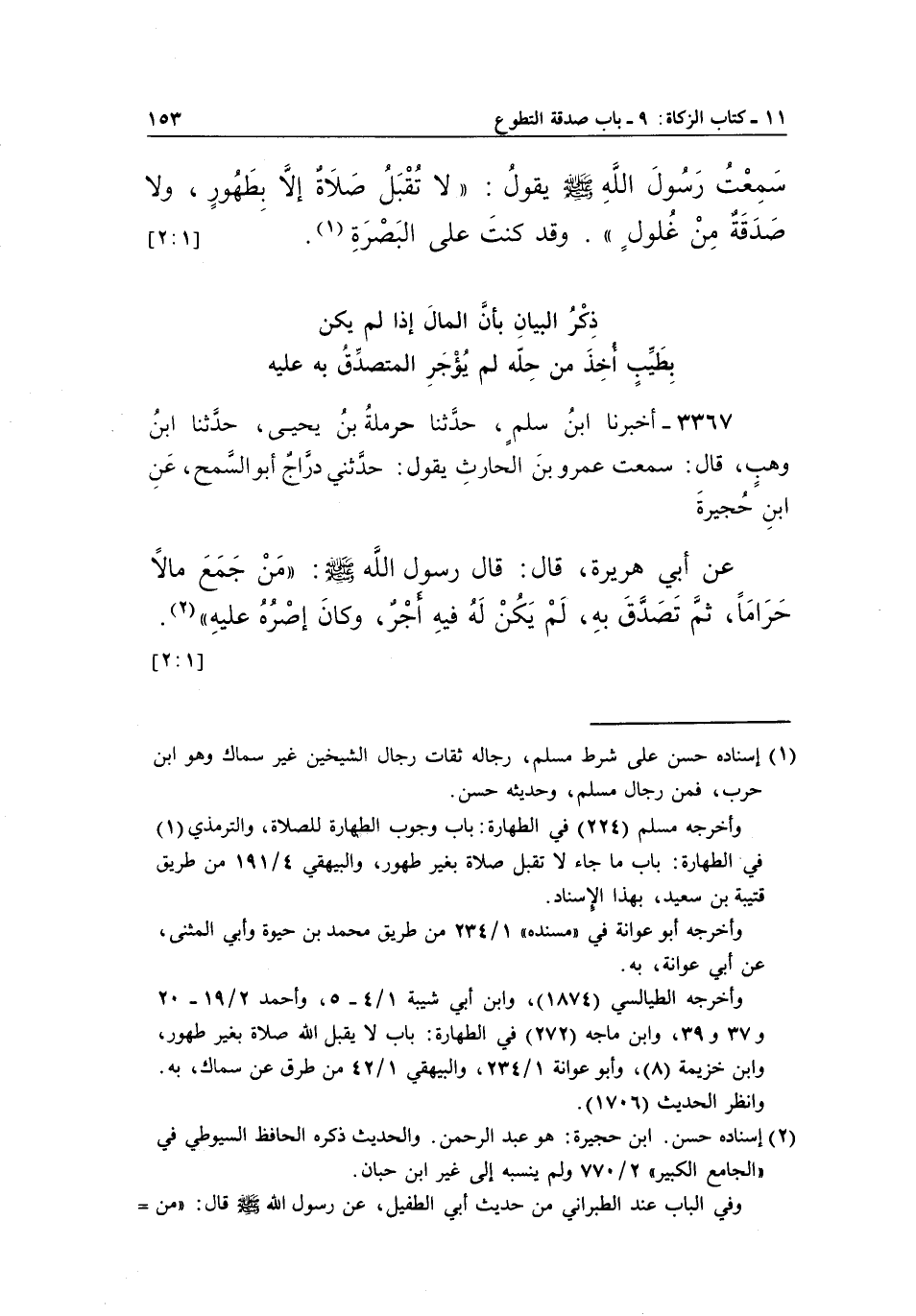 سَمِعْتُ رَسُولَ اللَّهِ صَلَّى اللَّهُ عَلَيْهِ وَسَلَّمَ يَقُولُ: "لَا تُقْبَلُ صَلَاةٌ إِلَّا بِطَهُورٍ، وَلَا صَدَقَةٌ مِنْ غُلُولٍ".