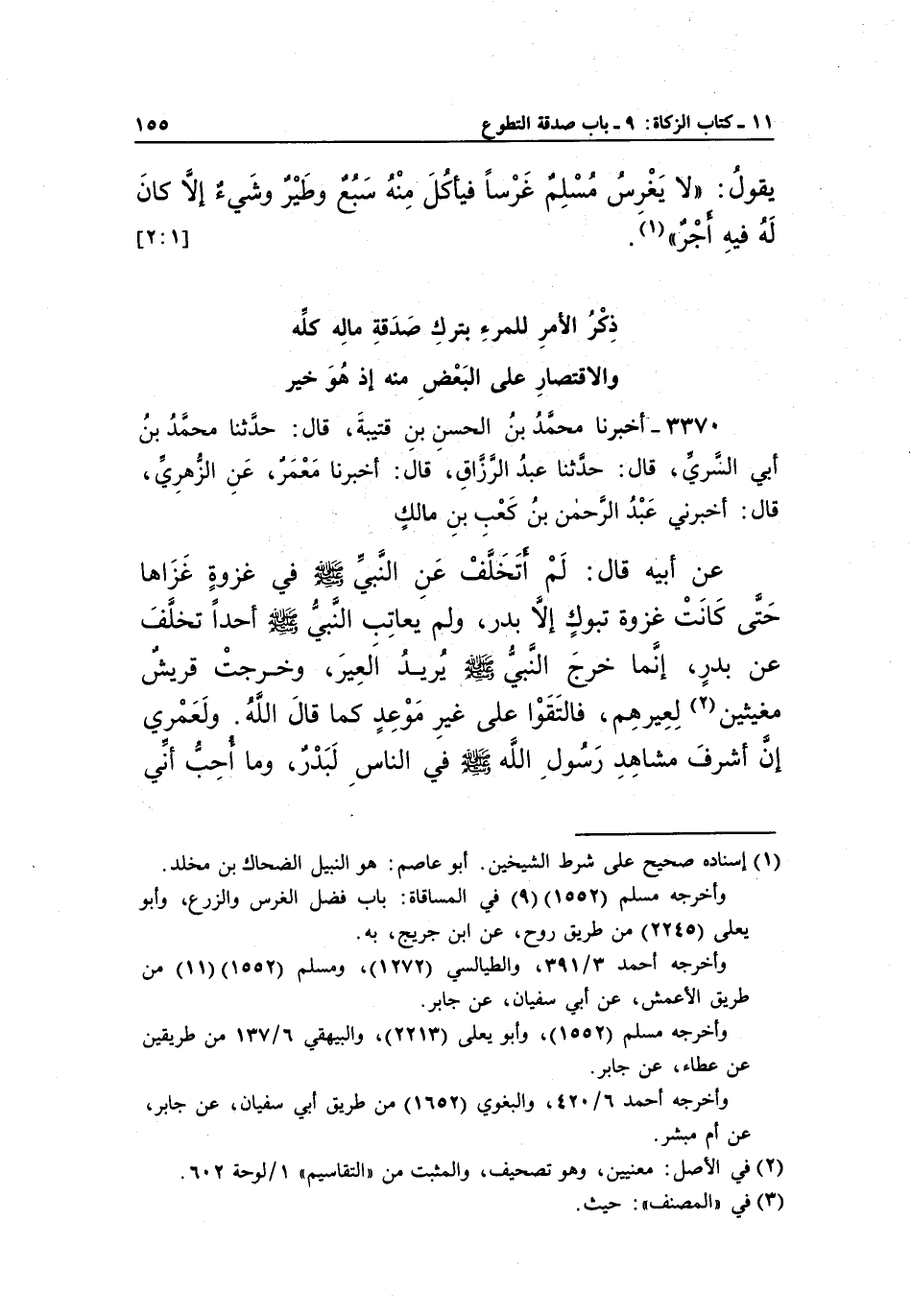 3370 - أَخْبَرَنَا مُحَمَّدُ بْنُ الْحَسَنِ بْنِ قُتَيْبَةَ، قَالَ: حَدَّثَنَا مُحَمَّدُ بْنُ أَبِي السَّرِيِّ، قَالَ: حَدَّثَنَا عَبْدُ الرَّزَّاقِ، قَالَ: أَخْبَرَنَا مَعْمَرٌ، عَنِ الزُّهْرِيِّ، قَالَ: أَخْبَرَنِي عَبْدُ الرَّحْمَنِ بْنُ كَعْبِ بْنِ مَالِكٍ