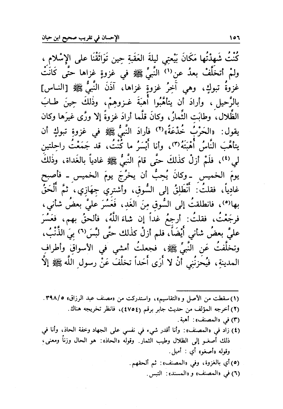 كُنْتُ شَهِدْتُهَا مَكَانَ بَيْعَتِي لَيْلَةَ الْعَقَبَةِ حِينَ توثقنا عَلَى الْإِسْلَامِ، وَلَمْ أَتَخَلَّفْ بَعْدُ عَنِ (1) النَّبِيِّ صَلَّى اللَّهُ عَلَيْهِ وَسَلَّمَ فِي غَزْوَةٍ غَزَاهَا حَتَّى كَانَتْ غَزْوَةُ تَبُوكَ، وَهِيَ آخِرُ غَزْوَةٍ غَزَاهَا، آذَنَ النَّبِيُّ صَلَّى اللَّهُ عَلَيْهِ وَسَلَّمَ [النَّاسَ] بِالرَّحِيلِ، وَأَرَادَ أَنْ يَتَأَهَّبُوا أُهْبَةَ غَزْوِهِمْ، وَذَلِكَ حِينَ طَابَ الظِّلَالُ، وَطَابَتِ الثِّمَارُ، وَكَانَ قَلَّمَا أَرَادَ غَزْوَةً إِلَّا وَرَّى غَيْرَهَا وَكَانَ يَقُولُ: "الْحَرْبُ خُدْعَةٌ" (2) فَأَرَادَ النَّبِيِّ صَلَّى اللَّهُ عَلَيْهِ وَسَلَّمَ فِي غَزْوَةٍ تَبُوكَ أَنْ يَتَأَهَّبَ النَّاسُ أُهْبَتَهُ (3) ، وَأَنَا أَيْسَرُ مَا كُنْتُ، قَدْ جَمَعْتُ رَاحِلَتَيْنِ لِي (4) ، فَلَمْ أَزَلْ كَذَلِكَ حَتَّى قَامَ النَّبِيُّ صَلَّى اللَّهُ عَلَيْهِ وَسَلَّمَ غَادِيًا بِالْغَدَاةِ، وَذَلِكَ يَوْمُ الْخَمِيسِ -وَكَانَ يُحِبُّ أَنْ يَخْرُجَ يَوْمَ الْخَمِيسِ- فَأَصْبَحَ غَادِيًا، فَقُلْتُ: أَنْطَلِقُ إِلَى السُّوقِ، وَأَشْتَرِي جِهَازِي، ثُمَّ أَلْحَقُ بِهَا (5) ، فَانْطَلَقْتُ إِلَى السُّوقِ مِنَ الْغَدِ، فَعَسُرَ عَلَيَّ بَعْضُ شَأْنِي، فَرَجَعْتُ، فَقُلْتُ: أَرْجِعُ غَدًا إِنْ شَاءَ اللَّهُ، فَأَلْحَقُ بِهِمْ، فَعَسُرَ عَلَيَّ بَعْضُ شَأْنِي أَيْضًا، فَلَمْ أَزَلْ كَذَلِكَ حَتَّى لَبَّسَ (6) بِيَ الذَّنْبُ، وَتَخَلَّفْتُ عَنِ النَّبِيِّ صَلَّى اللَّهُ عَلَيْهِ وَسَلَّمَ، فَجَعَلْتُ أَمْشِي فِي الْأَسْوَاقِ وَأَطْرَافِ الْمَدِينَةِ، فَيُحْزِنُنِي أَنْ لَا أَرَى أَحَدًا تَخَلَّفَ عَنْ رَسُولِ اللَّهِ صَلَّى اللَّهُ عَلَيْهِ وَسَلَّمَ إلا