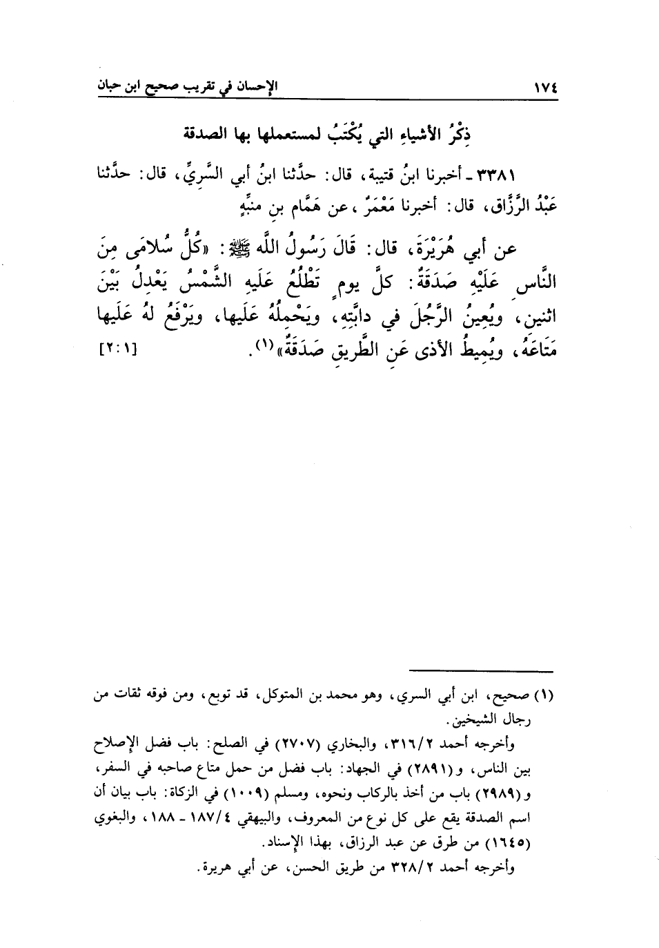 وأخرجه أحمد 2/316، والبخاري "2707" في الصلح: باب فضل الإصلاح بين الناس، و "2891" في الجهاد: باب فضل من حمل متاع صاحبه في السفر، و "2989" باب من أخذ بالركاب ونحوه، ومسلم "1009" في الزكاة: باب بيان أن اسم الصدقة يقع على كل نوع من المعروف، والبيهقي 4/187-188، والبغوي "1645" من طرق عن عبد الرزاق، بهذا الإسناد.