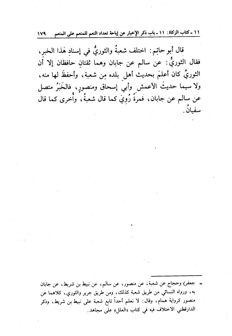 قَالَ أَبُو حَاتِمٍ: اخْتَلَفَ شُعْبَةُ وَالثَّوْرِيُّ فِي إِسْنَادِ هَذَا الْخَبَرِ، فَقَالَ الثَّوْرِيُّ: عَنْ سَالِمٍ عَنْ جَابَانَ وَهُمَا ثِقَتَانِ حَافِظْانِ إِلَّا أَنَّ الثَّوْرِيَّ كَانَ أَعْلَمَ بِحَدِيثِ أَهْلِ بَلَدِهِ مِنْ شُعْبَةَ، وَأَحْفَظُ لَهَا مِنْهُ، وَلَا سِيَّمَا حَدِيثَ الْأَعْمَشِ وَأَبِي إِسْحَاقَ وَمَنْصُورٍ فَالْخَبَرُ مُتَّصِلٌ عَنْ سَالِمٍ عَنْ جَابَانَ، فَمَرَّةٌ رُوِيَ كَمَا قَالَ شعبة، وأخرى كما قال سفيان.