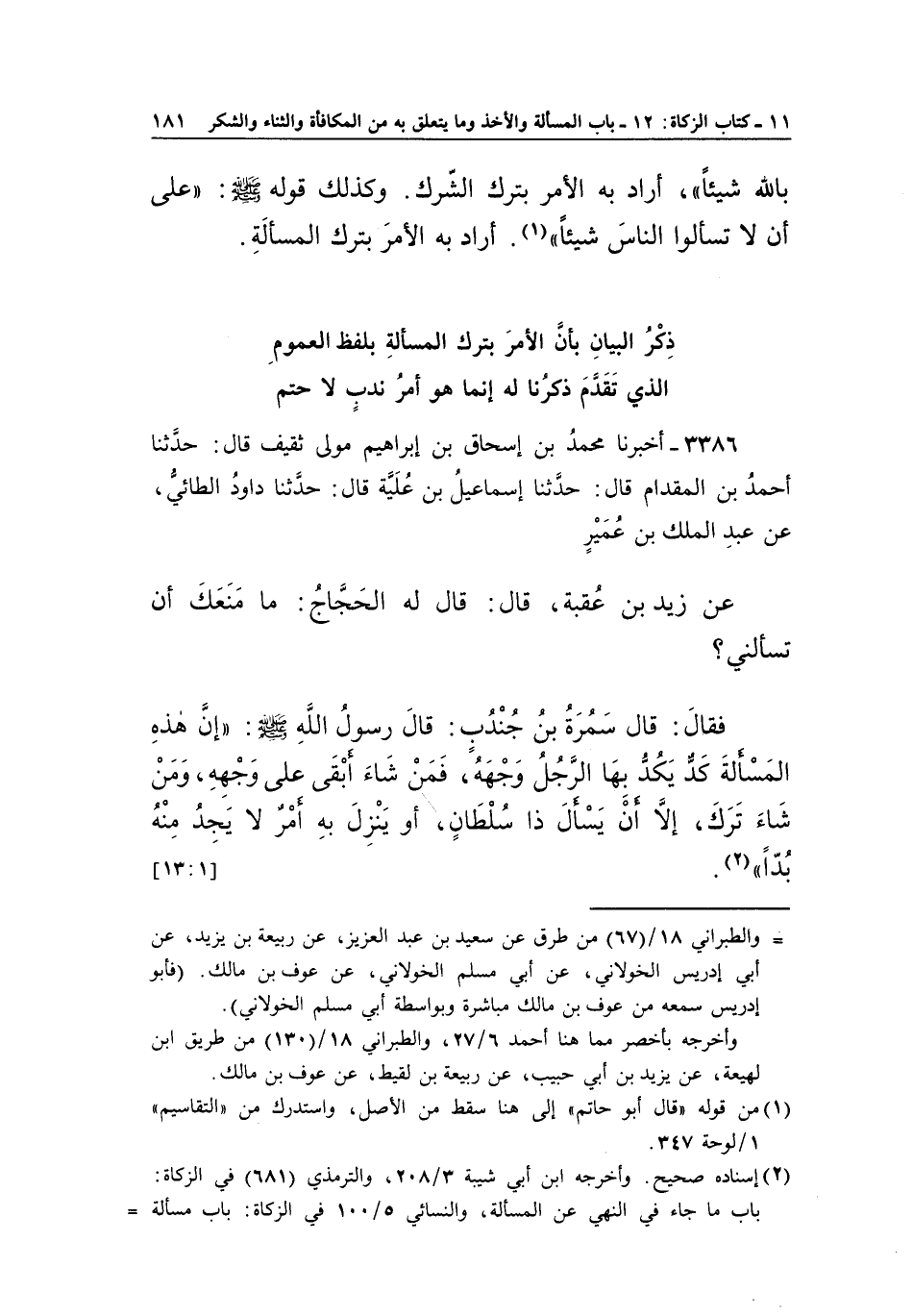 3386 - أَخْبَرَنَا مُحَمَّدُ بْنُ إِسْحَاقَ بْنِ إِبْرَاهِيمَ، مَوْلَى ثَقِيفٍ، قَالَ: حَدَّثَنَا أَحْمَدُ بْنُ الْمِقْدَامِ، قَالَ: حَدَّثَنَا إِسْمَاعِيلُ بْنُ عُلَيَّةَ، قَالَ: حَدَّثَنَا دَاوُدُ الطَّائِيُّ، عَنْ عَبْدِ الْمَلِكِ بْنِ عُمَيْرٍ، عَنْ زَيْدِ بْنِ عُقْبَةَ، قَالَ: قَالَ لَهُ الْحَجَّاجُ مَا مَنَعَكَ أَنْ تَسْأَلَنِي؟ فَقَالَ: قَالَ سَمُرَةُ بْنُ جُنْدُبٍ: قَالَ رَسُولُ اللَّهِ صَلَّى اللَّهُ عَلَيْهِ وَسَلَّمَ: «إِنَّ هَذِهِ الْمَسْأَلَةَ كَدٌّ يَكُدُّ بِهَا الرَّجُلُ وَجْهَهُ، فَمَنْ شَاءَ أَبْقَى عَلَى وَجْهِهِ، وَمَنْ شَاءَ تَرَكَ، إِلَّا أَنْ يَسْأَلَ ذَا سُلْطَانٍ أَوْ يَنْزِلَ بِهِ أَمْرٌ لَا يَجِدُ مِنْهُ بَدًّا» (¬2) [1: 13]