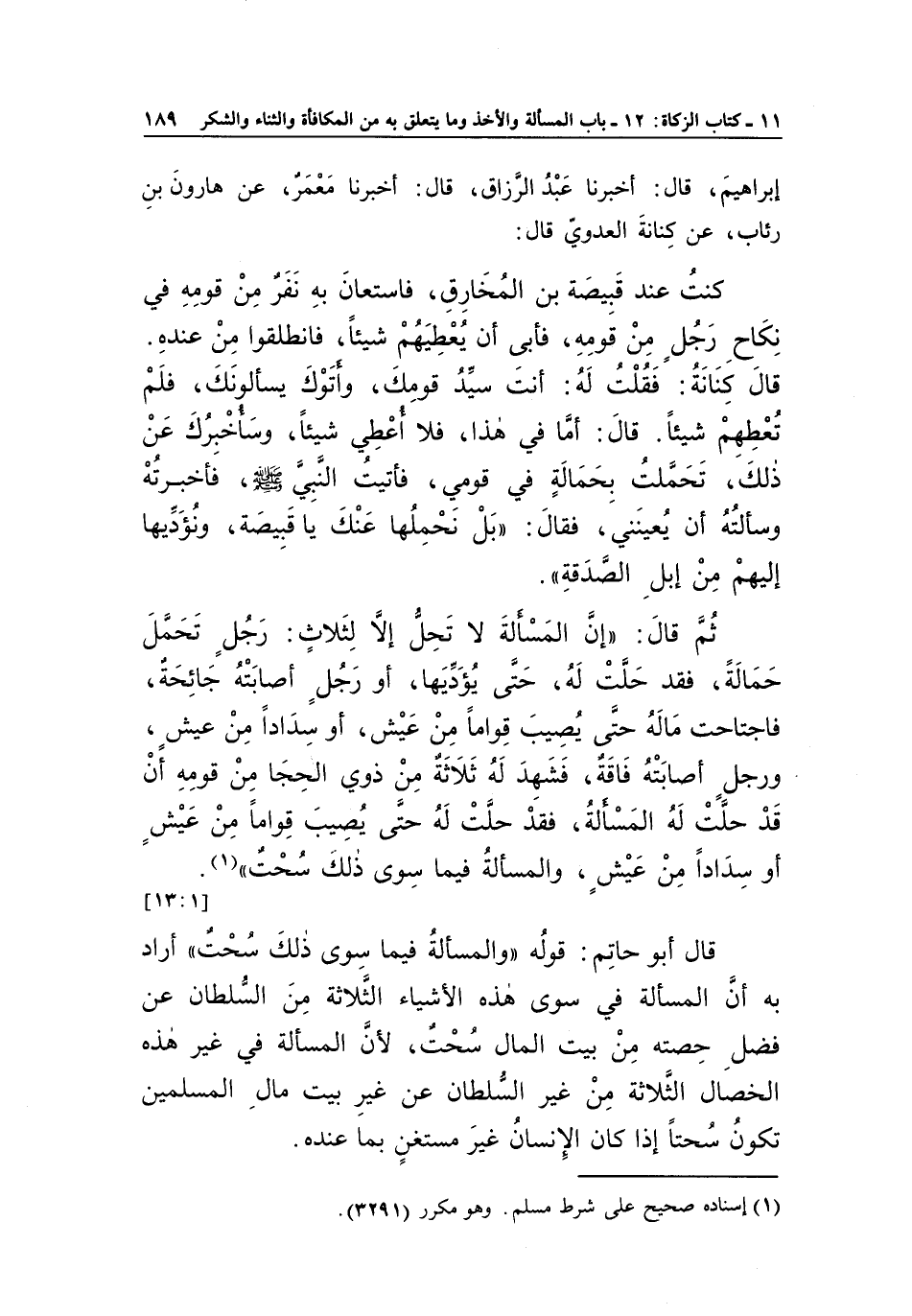 إِبْرَاهِيمَ، قَالَ: أَخْبَرَنَا عَبْدُ الرَّزَّاقِ، قَالَ: أَخْبَرَنَا مَعْمَرٌ، عَنْ هَارُونَ بْنِ رِئَابٍ، عَنْ كِنَانَةَ الْعَدَوِيِّ، قَالَ: كُنْتُ عِنْدَ قَبِيصَةَ بْنِ الْمُخَارِقِ فَاسْتَعَانَ بِهِ نَفَرٌ مِنْ قَوْمِهِ فِي نِكَاحِ رَجُلٍ مِنْ قَوْمِهِ، فَأَبَى أَنْ يُعْطِيَهُمْ شَيْئًا، فَانْطَلَقُوا مِنْ عِنْدِهِ، قَالَ كِنَانَةُ: فَقُلْتُ لَهُ: أَنْتَ سَيِّدُ قَوْمِكَ، وَأَتَوْكَ يَسْأَلُونَكَ، فَلَمْ تُعْطِهِمْ شَيْئًا، قَالَ: أَمَّا فِي هَذَا، فَلَا أُعْطِي شَيْئًا، وَسَأُخْبِرُكَ عَنْ ذَلِكَ، تَحَمَّلْتُ بِحَمَالَةٍ فِي قَوْمِي، فَأَتَيْتُ النَّبِيَّ صَلَّى اللَّهُ عَلَيْهِ وَسَلَّمَ، فَأَخْبَرْتُهُ وَسَأَلْتُهُ أَنْ يُعِينَنِي، فَقَالَ: «بَلْ نَحْمِلُهَا عَنْكَ يَا قَبِيصَةُ، وَنُؤَدِّيهَا إِلَيْهِمْ مِنْ إِبِلِ الصَّدَقَةِ» ، ثُمَّ قَالَ: «إِنَّ الْمَسْأَلَةَ لَا تَحِلُّ إِلَّا لِثَلَاثٍ: رَجُلٍ تَحَمَّلَ حَمَالَةً، فَقَدْ حَلَّتْ لَهُ حَتَّى يُؤَدِّيَهَا، أَوْ رَجُلٍ أَصَابَتْهُ جَائِحَةٌ فَاجْتَاحَتْ مَالَهُ حَتَّى يُصِيبَ قِوَامًا مِنْ عَيْشٍ أَوْ سِدَادًا مِنْ عَيْشٍ، وَرَجُلٍ أَصَابَتْهُ فَاقَةٌ فَشَهِدَ لَهُ ثَلَاثَةٌ مِنْ ذَوِي الْحِجَا مِنْ قَوْمِهِ أَنْ قَدْ حَلَّتْ لَهُ الْمَسْأَلَةُ، فَقَدْ حَلَّتْ لَهُ حَتَّى يُصِيبَ قِوَامًا مِنْ عَيْشٍ، أَوْ سِدَادًا مِنْ عَيْشٍ، وَالْمَسْأَلَةُ فِيمَا سِوَى ذَلِكَ سُحْتٌ» (¬1) . [1: 13]