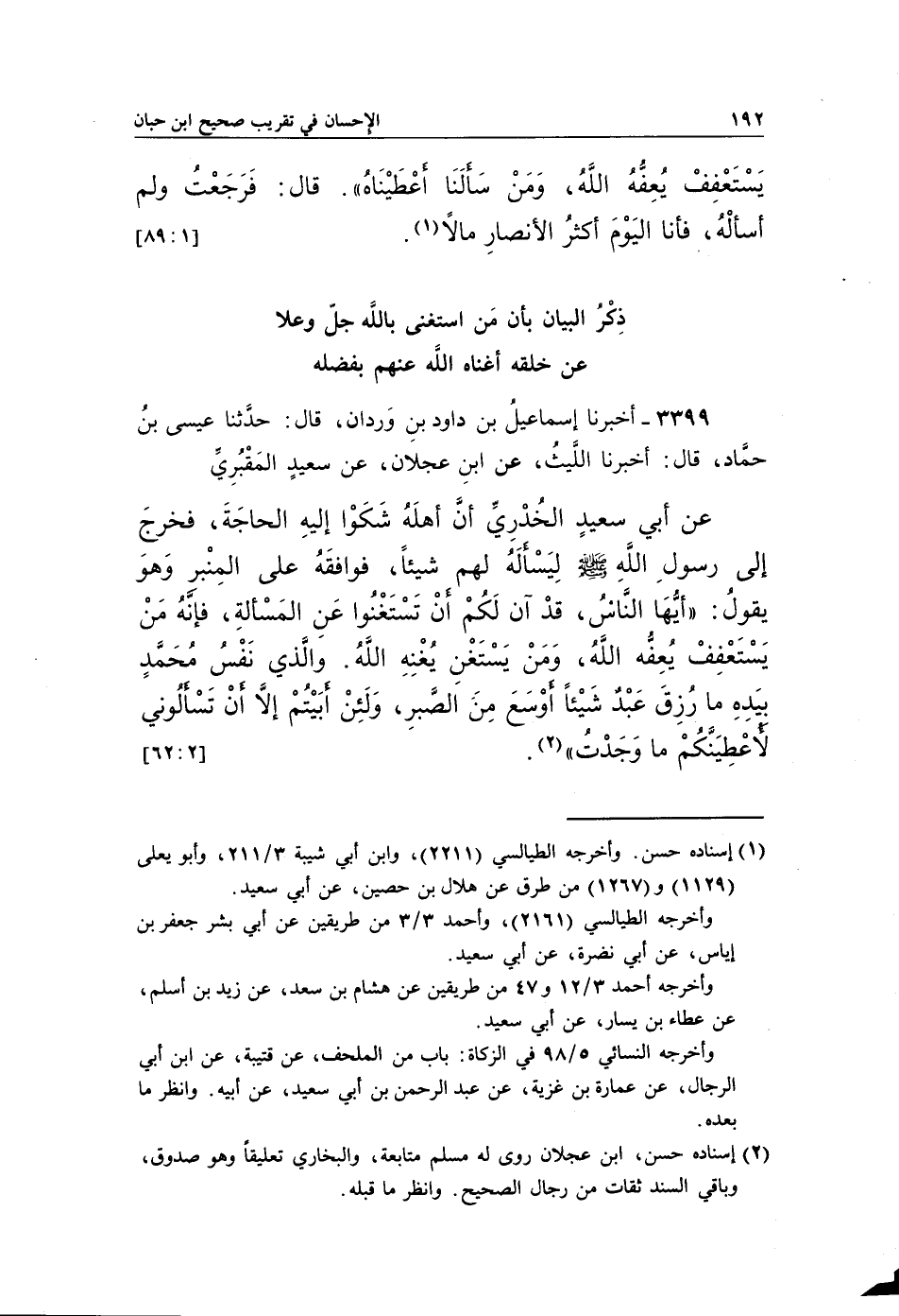 3399 - أَخْبَرَنَا إِسْمَاعِيلُ بْنُ دَاوُدَ بْنِ وَرْدَانَ، قَالَ: حَدَّثَنَا عِيسَى بْنُ حَمَّادٍ، قَالَ: أَخْبَرَنَا اللَّيْثُ، عَنِ ابْنِ عَجْلَانَ، عَنْ سَعِيدٍ الْمَقْبُرِيِّ، عَنْ أَبِي سَعِيدٍ الْخُدْرِيِّ، أَنَّ أَهْلَهُ شَكَوْا إِلَيْهِ الْحَاجَةَ، فَخَرَجَ إِلَى رَسُولِ اللَّهِ صَلَّى اللَّهُ عَلَيْهِ وَسَلَّمَ لَيَسْأَلَهُ لَهُمْ شَيْئًا، فَوَافَقَهُ عَلَى الْمِنْبَرِ، وَهُوَ يَقُولُ: «أَيُّهَا النَّاسُ، قَدْ آنَ لَكُمْ أَنْ تَسْتَغْنُوا عَنِ الْمَسْأَلَةِ، فَإِنَّهُ مَنْ يَسْتَعْفِفْ يُعِفُّهُ اللَّهُ، وَمَنْ يَسْتَغْنِ يُغْنِهِ اللَّهُ، وَالَّذِي نَفْسُ مُحَمَّدٍ بِيَدِهِ مَا رُزِقَ عَبْدٌ شَيْئًا أَوْسَعَ مِنَ الصَّبْرِ، وَلَئِنْ أَبَيْتُمْ إِلَّا أَنْ تَسْأَلُونِي لَأُعْطِيَنَّكُمْ مَا وَجَدْتُ» (¬2) . [2: 62]
