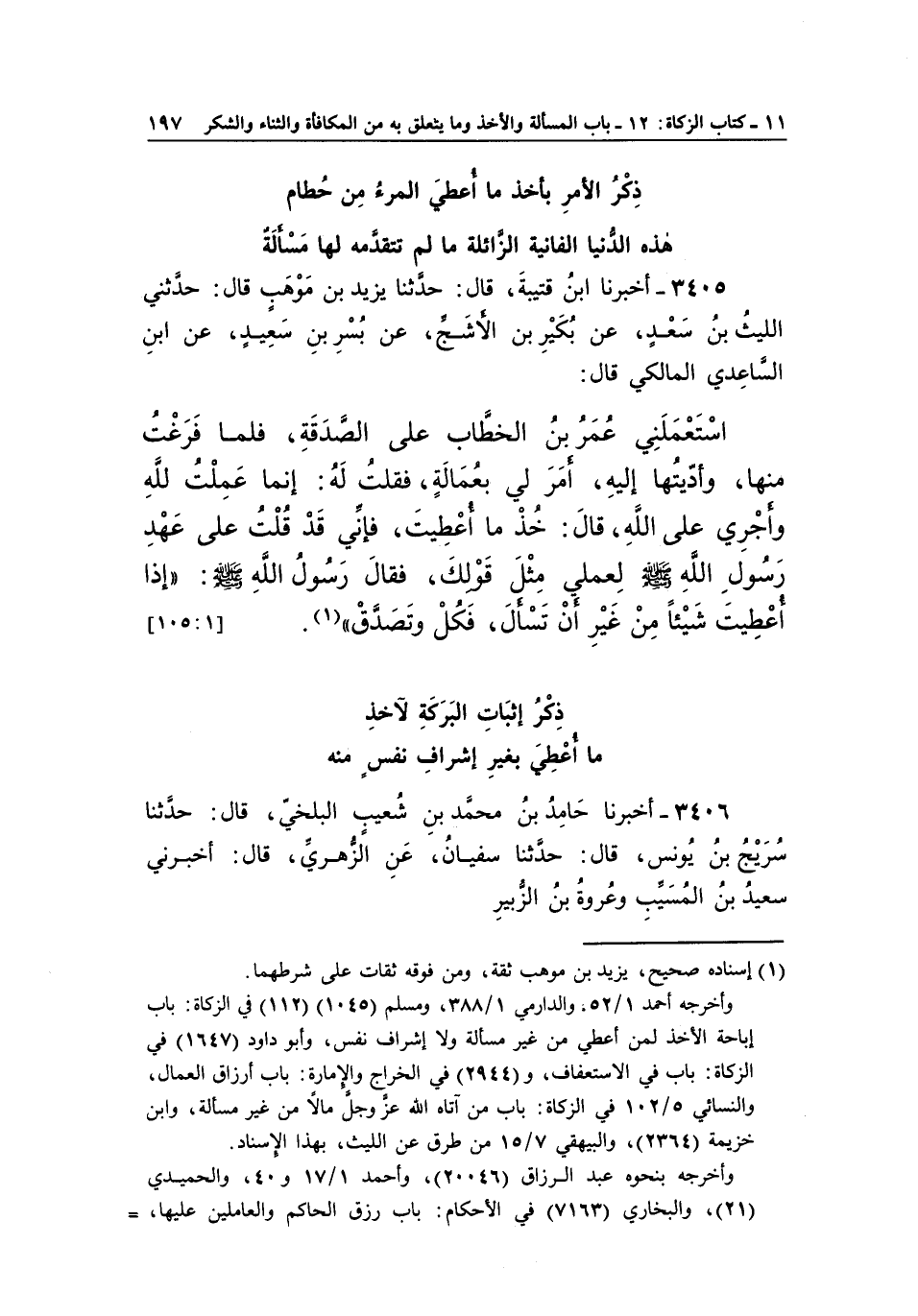 3405 - أخْبَرَنَا ابْنُ قُتَيْبَةَ، قَالَ: حَدَّثَنَا يَزِيدُ بْنُ مَوْهَبٍ، قَالَ: حَدَّثَنِي اللَّيْثُ بْنُ سَعْدٍ، عَنْ بُكَيْرِ بْنِ الْأَشَجِّ، عَنْ بُسْرِ بْنِ سَعِيدٍ، عَنِ ابْنِ السَّاعِدِيِّ الْمَالِكِيِّ، قَالَ: اسْتَعْمَلَنِي عُمَرُ بْنُ الْخَطَّابِ عَلَى الصَّدَقَةِ، فَلَمَّا فَرَغْتُ مِنْهَا وَأَدَّيْتُهَا إِلَيْهِ أَمَرَ لِيَ بِعُمَالَةٍ، فَقُلْتُ لَهُ: إِنَّمَا عَمِلْتُ لِلَّهِ، وَأَجْرِي عَلَى اللَّهِ، قَالَ: خُذْ مَا أُعْطِيتَ، فَإِنِّي قَدْ قُلْتُ عَلَى عَهْدِ رَسُولِ اللَّهِ صَلَّى اللَّهُ عَلَيْهِ وَسَلَّمَ لِعَمَلِي مِثْلَ قَوْلِكَ، فَقَالَ رَسُولُ اللَّهِ صَلَّى اللَّهُ عَلَيْهِ وَسَلَّمَ: «إِذَا أُعْطِيتَ شَيْئًا مِنْ غَيْرِ أَنْ تَسْأَلَ فَكُلْ وَتَصَدَّقْ» (¬1) . [1: 105]