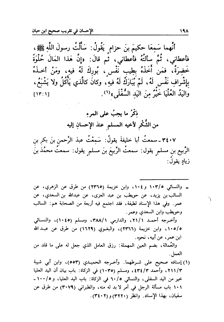 أَنَّهُمَا سَمِعَا حَكِيمَ بْنَ حِزَامٍ، يَقُولُ: سَأَلْتُ رَسُولَ اللَّهِ صَلَّى اللَّهُ عَلَيْهِ وَسَلَّمَ فَأَعْطَانِي، ثُمَّ سَأَلْتُهُ فَأَعْطَانِي، ثُمَّ قَالَ: «إِنَّ هَذَا الْمَالَ حُلْوَةٌ خَضِرَةٌ، فَمَنْ أَخَذَهُ بِطِيبِ نَفْسٍ بُورِكَ لَهُ فِيهِ، وَمَنْ أَخَذَهُ بِإِشْرَافِ نَفْسٍ لَهُ لَمْ يُبَارَكْ لَهُ فِيهِ، وَكَانَ كَالَّذِي يَأْكُلُ وَلَا يَشْبَعُ، وَالْيَدُ الْعُلْيَا خَيْرٌ مِنَ الْيَدِ السُّفْلَى» (¬1) . [1: 13]