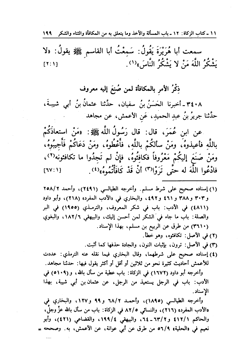 3408 - أَخْبَرَنَا الْحَسَنُ بْنُ سُفْيَانَ، حَدَّثَنَا عُثْمَانُ بْنُ أَبِي شَيْبَةَ، حَدَّثَنَا جَرِيرُ بْنُ عَبْدِ الْحَمِيدِ، عَنِ الْأَعْمَشِ، عَنْ مُجَاهِدٍ، عَنِ ابْنِ عُمَرَ، قَالَ: قَالَ رَسُولُ اللَّهِ صَلَّى اللَّهُ عَلَيْهِ وَسَلَّمَ: «مَنِ اسْتَعَاذَكُمْ بِاللَّهِ فَأَعِيذُوهُ، وَمَنْ سَأَلَكُمْ بِاللَّهِ فَأَعْطُوهُ، وَمَنْ دَعَاكُمْ فَأَجِيبُوهُ، وَمَنْ صَنَعَ إِلَيْكُمْ مَعْرُوفًا فَكَافِئُوهُ، فَإِنْ لَمْ تَجِدُوا مَا تُكَافِئُونَهُ (¬2) فَادْعُوا اللَّهَ لَهُ حَتَّى تَرَوْا (¬3) أَنْ قَدْ كَافَأْتُمُوهُ» (¬4) . [1: 67]