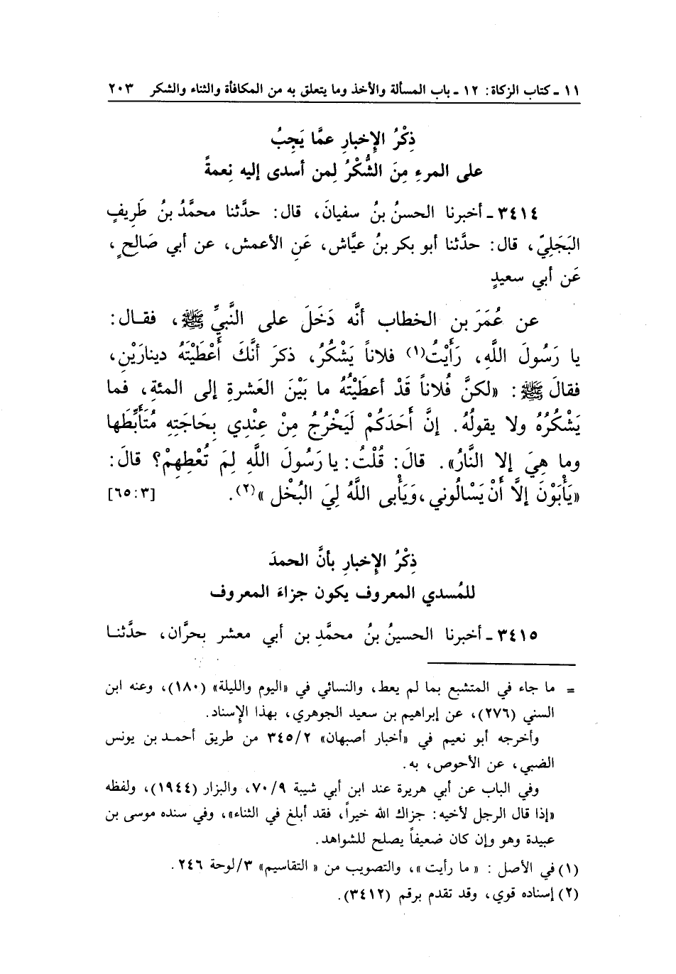3414 - أَخْبَرَنَا الْحَسَنُ بْنُ سُفْيَانَ، قَالَ: حَدَّثَنَا مُحَمَّدُ بْنُ طَرِيفٍ الْبَجَلِيُّ، قَالَ: حَدَّثَنَا أَبُو بَكْرِ بْنُ عَيَّاشٍ، عَنِ الْأَعْمَشِ، عَنْ أَبِي صَالِحٍ، عَنْ أَبِي سَعِيدٍ، عَنْ عُمَرَ بْنِ الْخَطَّابِ، أَنَّهُ دَخَلَ عَلَى النَّبِيِّ صَلَّى اللَّهُ عَلَيْهِ وَسَلَّمَ، فَقَالَ: يَا رَسُولَ اللَّهِ، رَأَيْتُ (¬1) فُلَانًا يَشْكُرُ، ذَكَرَ أَنَّكَ أَعْطَيْتَهُ دِينَارَيْنِ، فَقَالَ صَلَّى اللَّهُ عَلَيْهِ وَسَلَّمَ: «لَكِنَّ فُلَانًا قَدْ أَعْطَيْتُهُ مَا بَيْنَ الْعَشَرَةِ إِلَى الْمِئَةِ، فَمَا يَشْكُرُهُ وَلَا يَقُولُهُ، إِنَّ أَحَدَكُمْ لَيَخْرُجُ مِنْ عِنْدِي لِحَاجَتِهِ مُتَأَبِّطَهَا، وَمَا هِيَ إِلَّا النَّارُ» ، قَالَ: قُلْتُ: يَا رَسُولَ اللَّهِ لِمَ تُعْطِهِمْ؟، قَالَ: «يَأْبَوْنَ إِلَّا أَنْ يَسْأَلُونِي، وَيَأْبَى اللَّهُ لِيَ الْبُخْلَ» (¬2) . [3: 65]