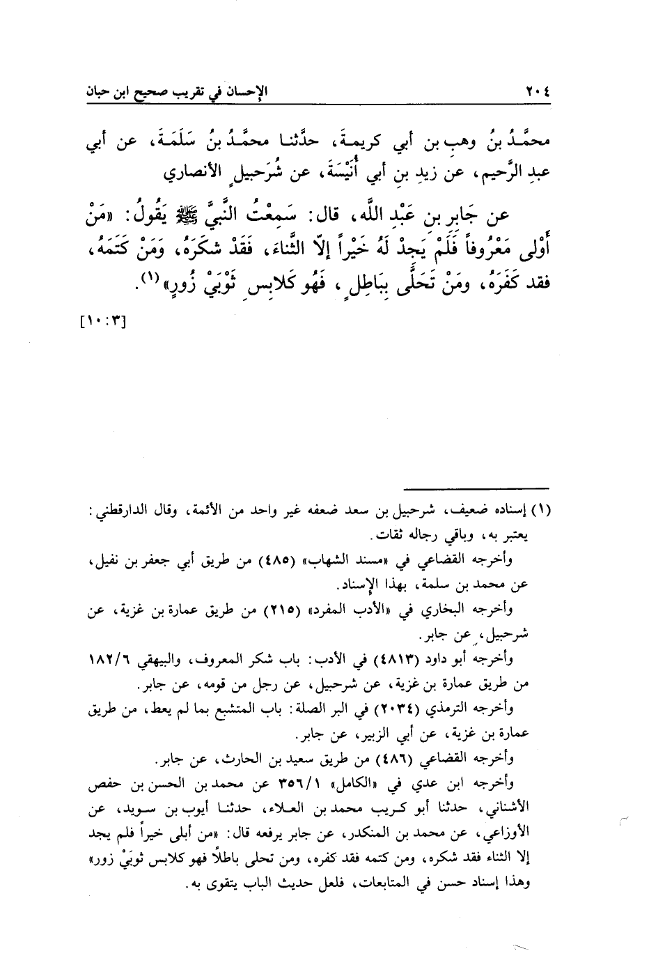 مُحَمَّدُ بْنُ وَهْبِ بْنِ أَبِي كَرِيمَةَ، حَدَّثَنَا مُحَمَّدُ بْنُ سَلَمَةَ، عَنْ أَبِي عَبْدِ الرَّحِيمِ، عَنْ زَيْدِ بْنِ أَبِي أُنَيْسَةَ، عَنْ شُرَحْبِيلَ الْأَنْصَارِيِّ، عَنْ جَابِرِ بْنِ عَبْدِ اللَّهِ، قَالَ: سَمِعْتُ النَّبِيَّ صَلَّى اللَّهُ عَلَيْهِ وَسَلَّمَ، يَقُولُ: «مَنْ أُولِيَ مَعْرُوفًا فَلَمْ يَجِدْ لَهُ خَيْرًا إِلَّا الثَّنَاءَ، فَقَدْ شَكَرَهُ، وَمَنْ كَتَمَهُ فَقَدْ كَفَرَهُ، وَمَنْ تَحَلَّى بِبَاطِلٍ فَهُوَ كَلَابِسِ ثَوْبَيْ زُورٍ» (¬1) . [3: 10]