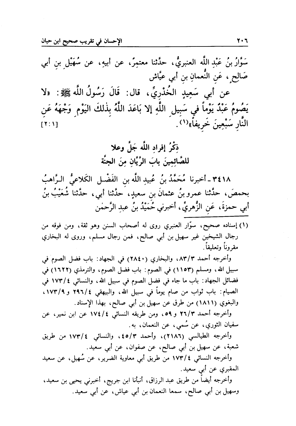 3418 - أَخْبَرَنَا مُحَمَّدُ بْنُ عُبَيْدِ اللَّهِ بْنِ الْفَضْلِ الْكَلَاعِيُّ الرَّاهِبُ بِحِمْصَ، حَدَّثَنَا عَمْرُو بْنُ عُثْمَانَ بْنِ سَعِيدٍ، حَدَّثَنَا أَبِي، حَدَّثَنَا شُعَيْبُ بْنُ أَبِي حَمْزَةَ، عَنِ الزُّهْرِيِّ، أخبرني حميد بن عبد الرحمنذكر إِفْرَادِ اللَّهِ جَلَّ وَعَلَا لِلصَّائِمِينَ بَابَ الرَّيَّانِ مِنَ الْجَنَّةِ